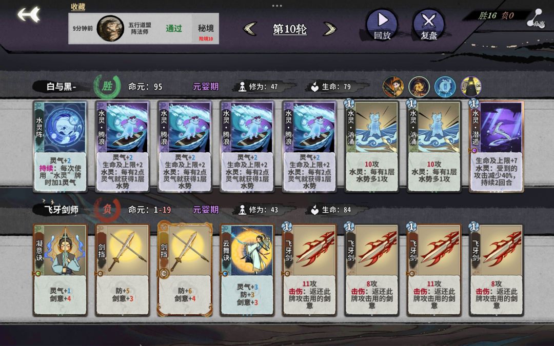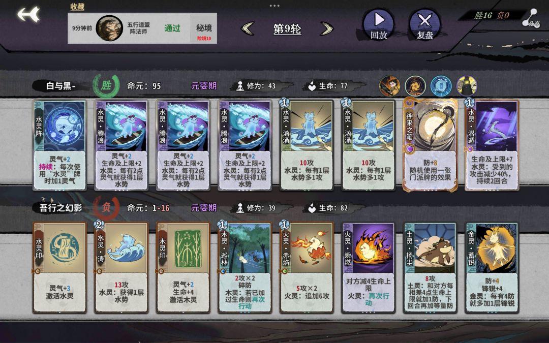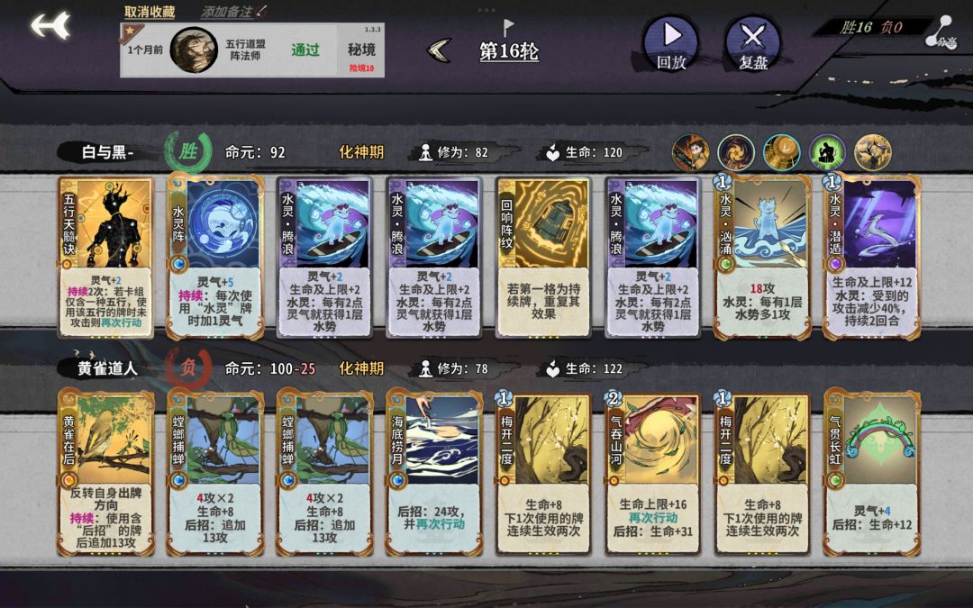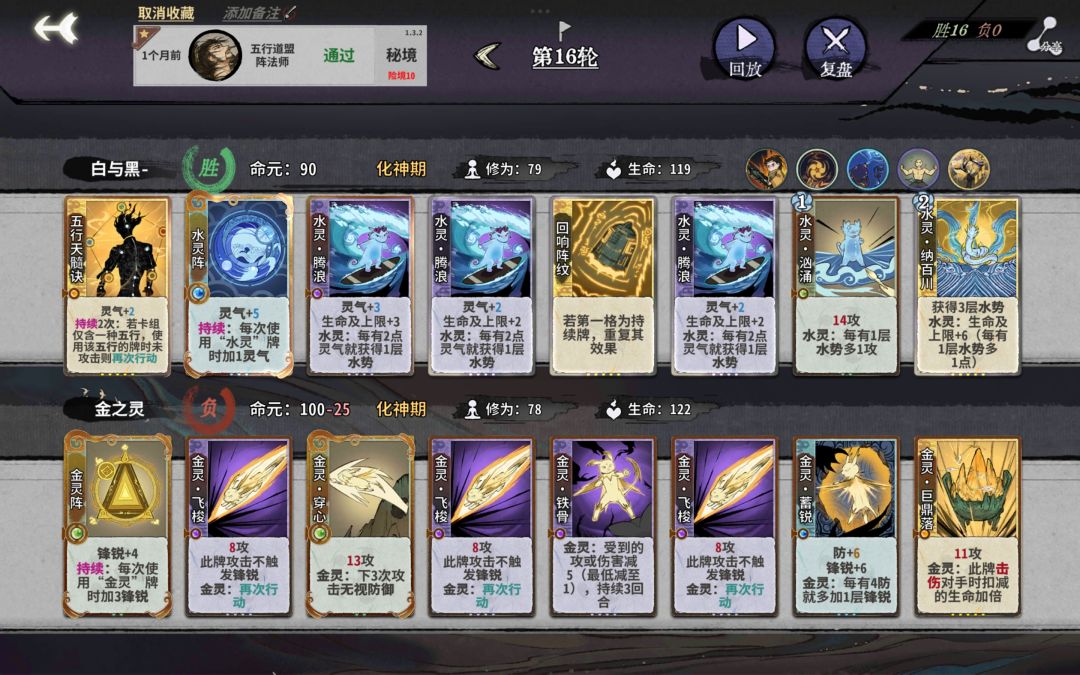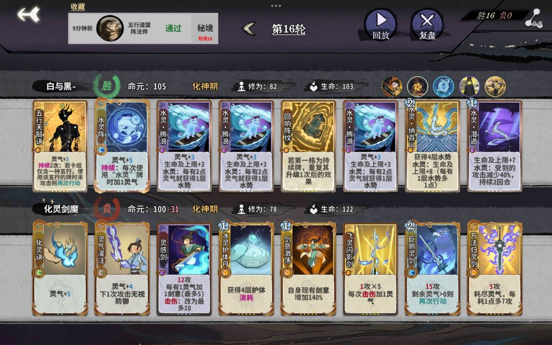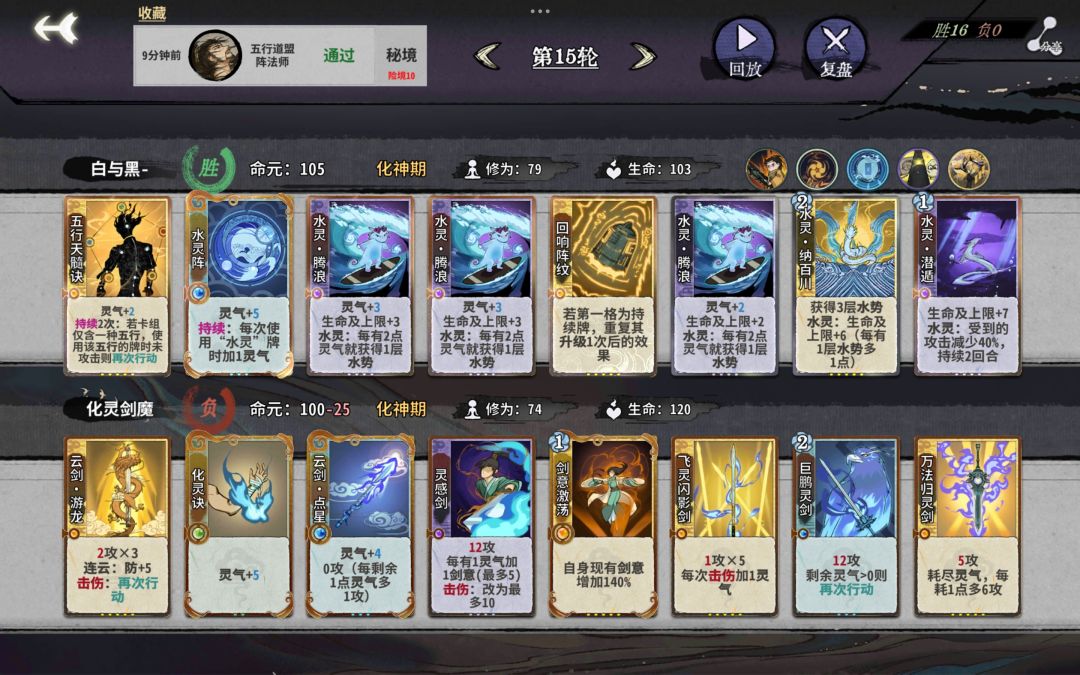 第11轮上化神选自带仙命拿两张金丹期以上水牌,这里拿了个水阵和泉涌,然后开始d牌找天髓回响纳百川什么的,这里因为刚上化神没什么牌d,所以阵容基本上没什么变化。