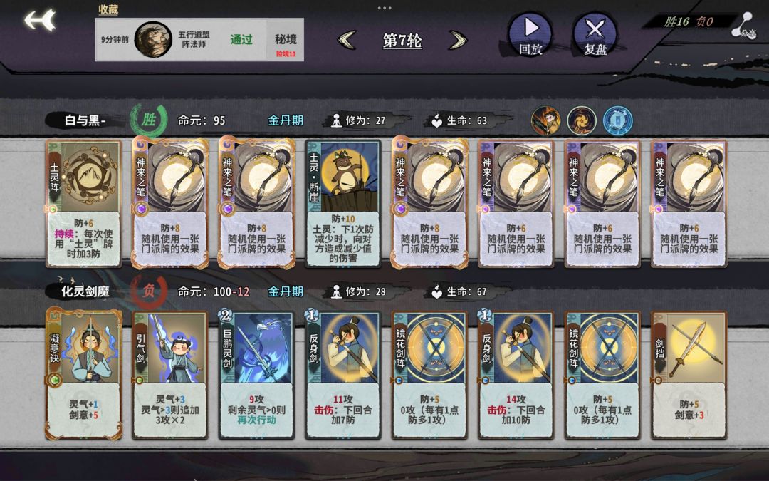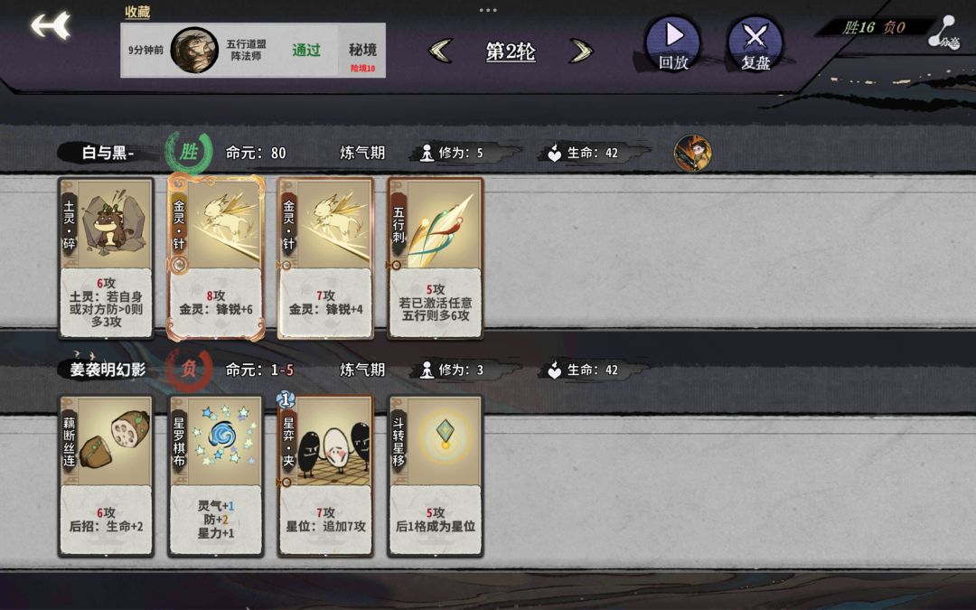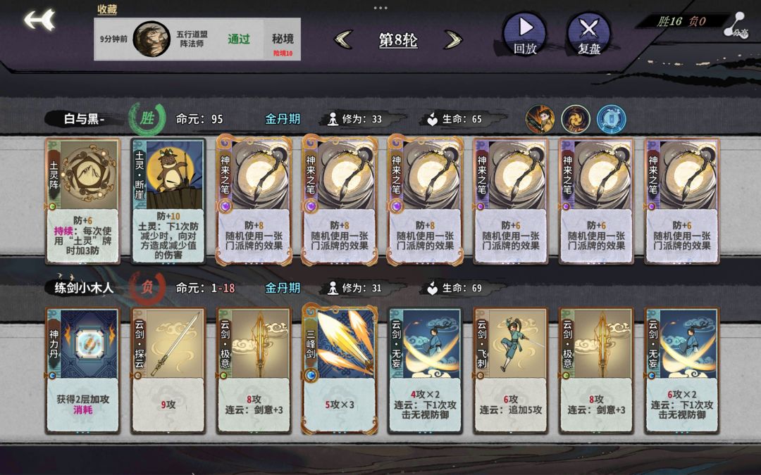 第16轮记住15轮赢了触发被动还能有2次换牌机会,这里又d出张纳百川直接合了,不用变阵,5动浅遁刚好对位上6动的飞灵,然后万法之前刚好能纳百川奶一口。