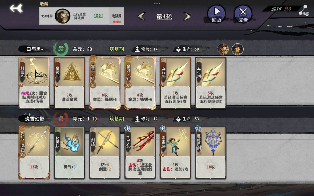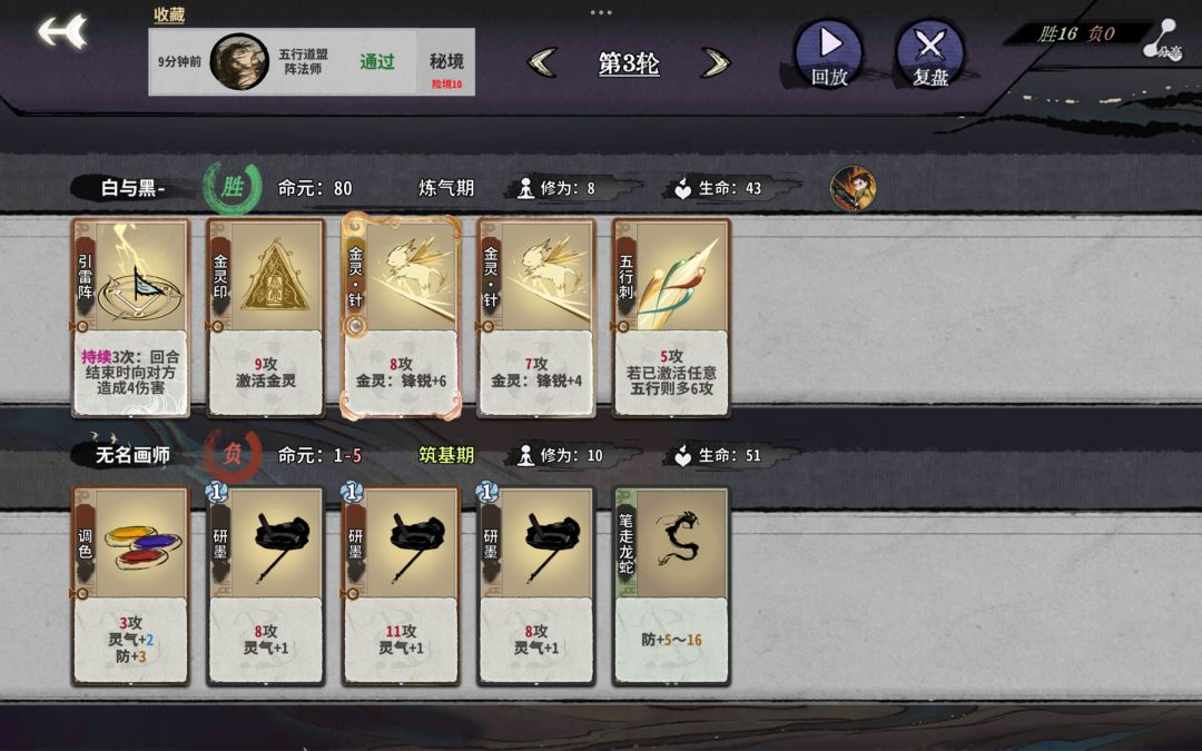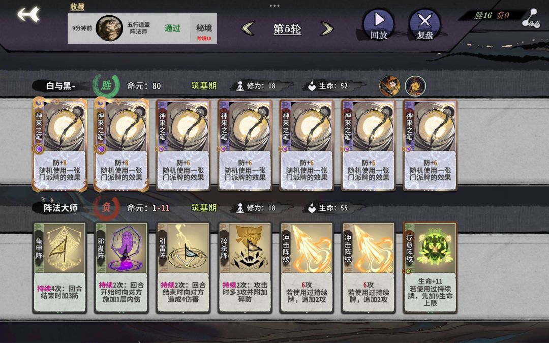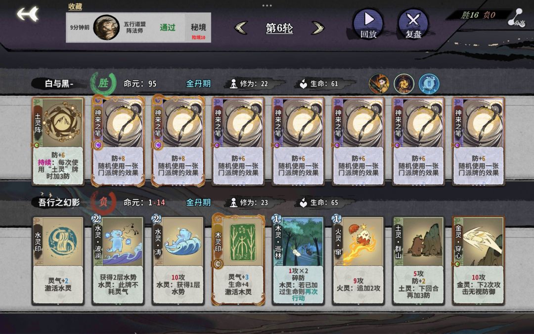 第5轮遇到神来之砚事件直接选择换牌,吾行之能激活第一个五行,神来之笔产生配合的概率大一点。然后因为道韵了腾浪吾行之前期没修也没遇到拿修事件所以先不上金丹。