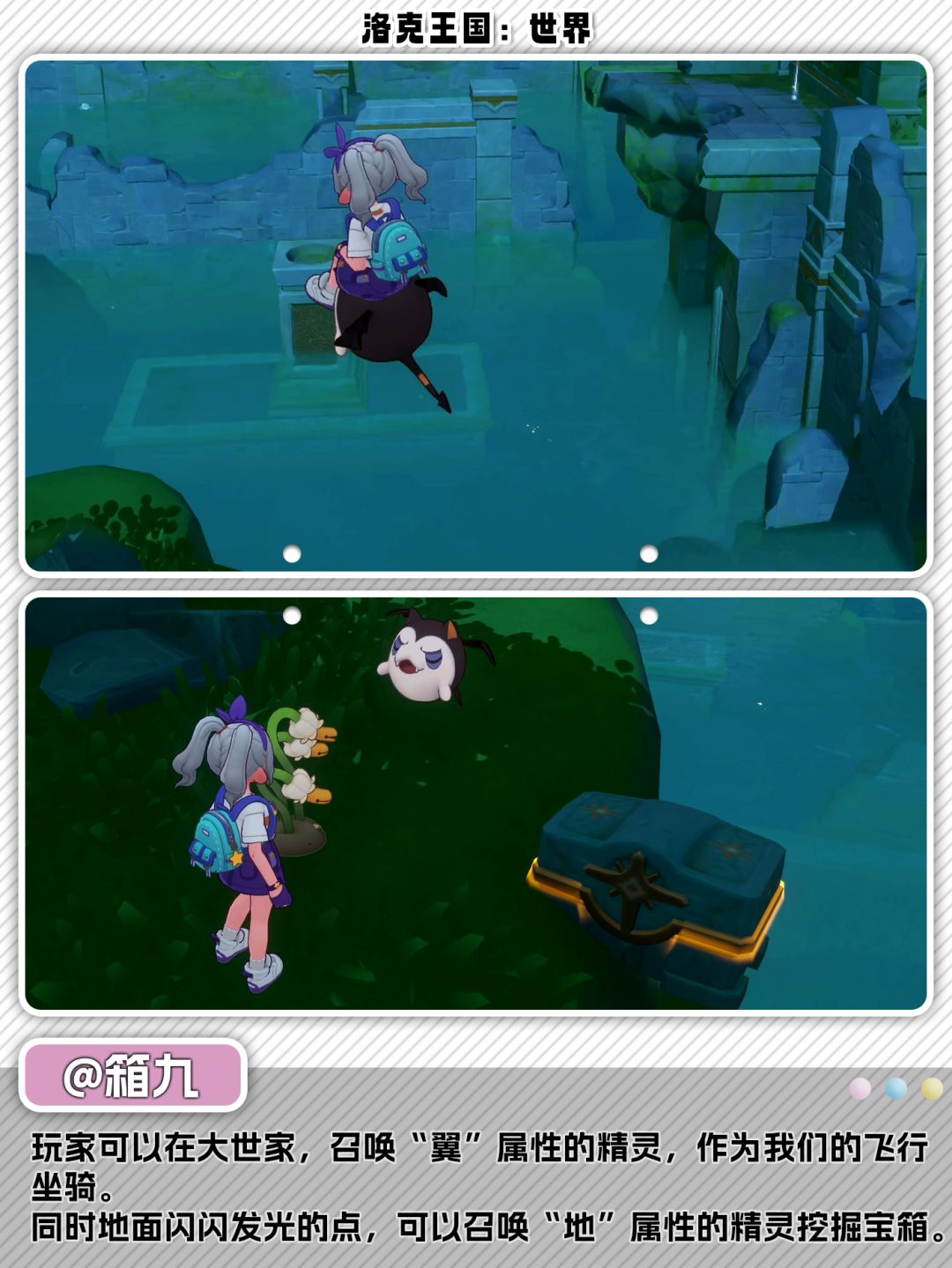 与精灵的互动特别足,不管是在精灵面板上点击互动,还是它们在大世界里,与我们一些实用的交互。比如有的翼系精灵可以带我们滑翔或飞翔,有的精灵可以开视野,帮我们确定周围哪里有可以打开的宝箱等等,也有的……emm,可以拿来卖萌,跟我们牵手手一起走,或者抱着它一起走,也有可以骑乘的精灵!