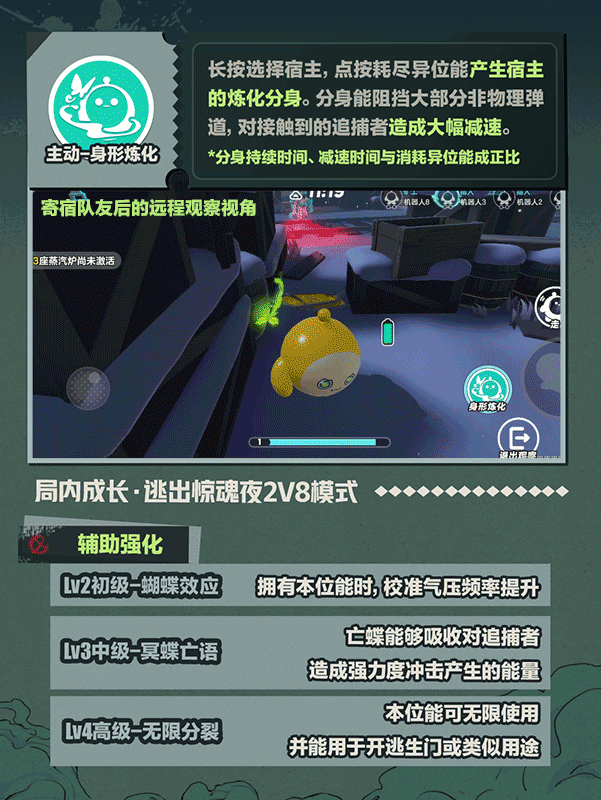 【基础介绍】得益于自己的“出色发明”,伊万德能在不影响挖煤或其它工作的同时,用亡蝶寄生队友并远程观察宿主,在合适时机施以“怜悯”。