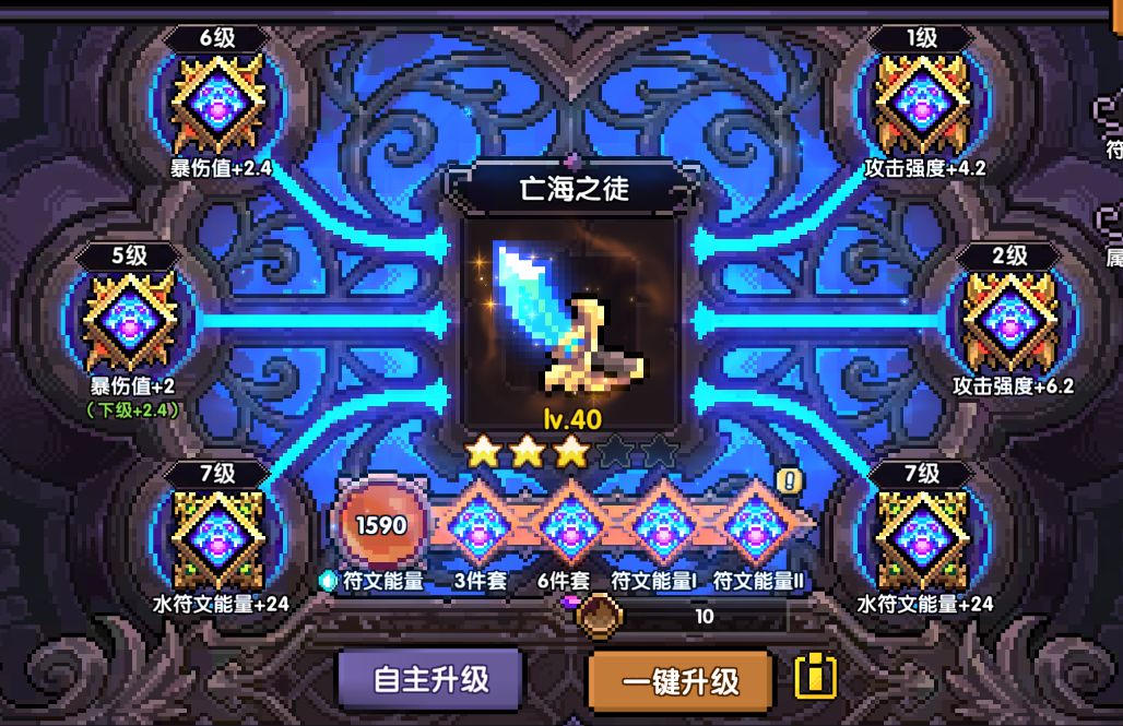 这套为不缺伤害带法,头披风胸甲出兆祸套任意即可。主武器升级至点满水能量即可