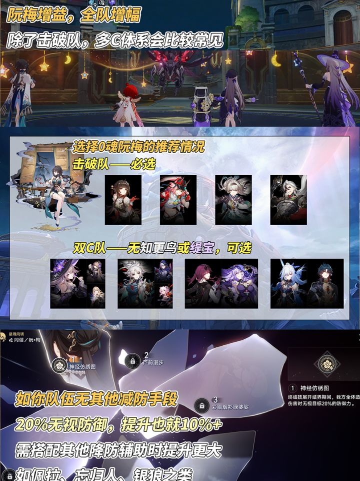 【2-6魂意义不大】星魂2挺尴尬,击破队不需要额外的攻击力提升,非击破队整局下来并无太多对线弱点击破状态敌人的机会;星魂3、5,少量提升阮梅增伤、穿透、速度;星魂4、6则是阮梅自身伤害,放在当前版本意义不大了。