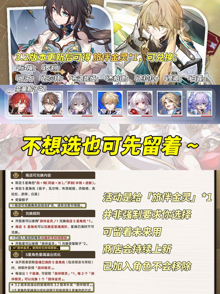若上述皆非你考虑的情况,冻梨建议将「旅伴金灵」留着!这点官方有做解释:①「旅伴金灵」永久时限,无需担心未使用而消失;②兑换商店后续会不断扩充,未来可兑换其他角色;③已加入角色不会移除,哪怕后面真有完美契合阮梅/罗刹的角色,也可再选,不必急着决定。