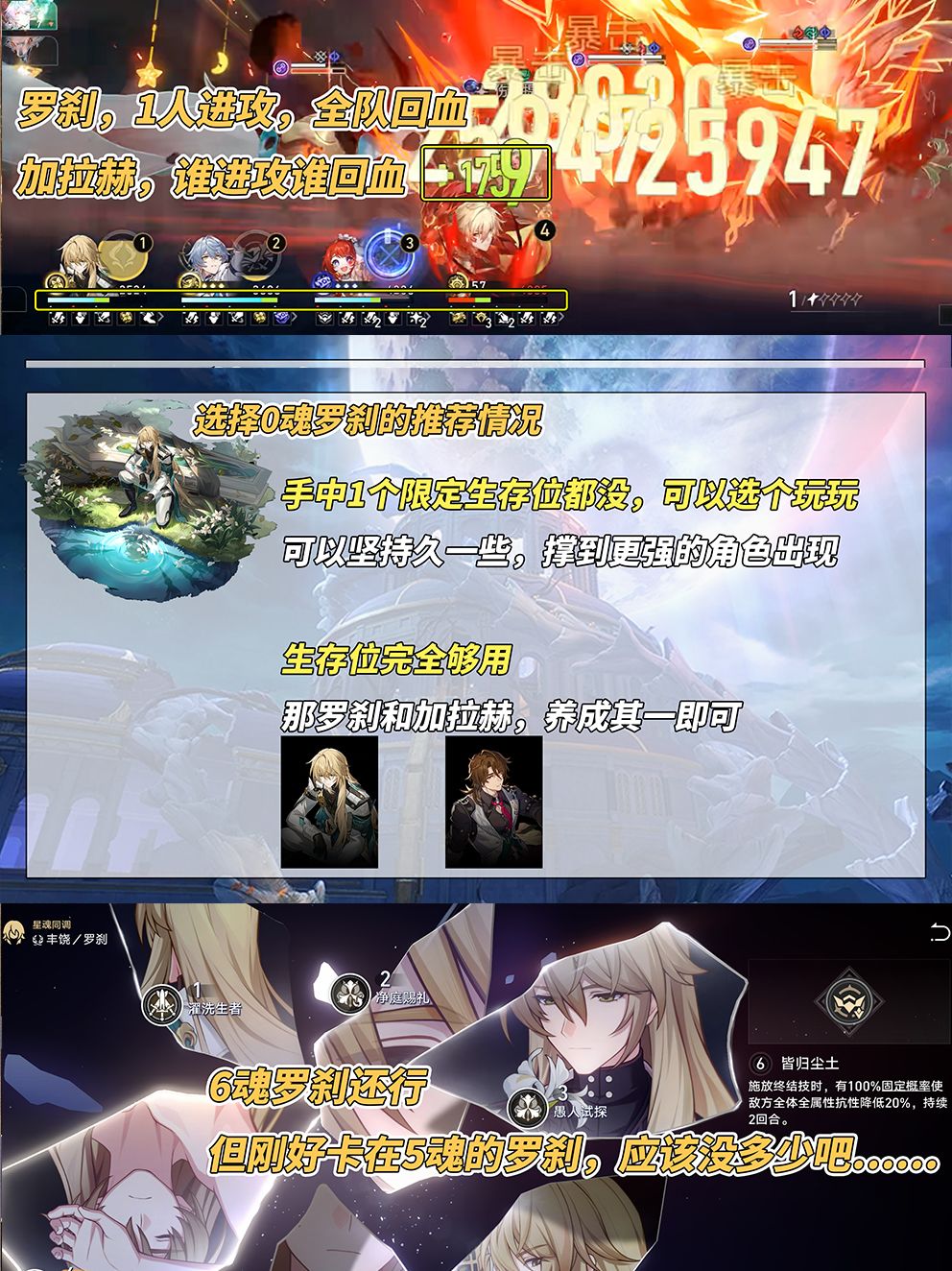 【0魂本体】仅推荐手中无限定生存位的玩家考虑,能够带你多跳过几个生存位卡池,能撑到更强的角色出现。若你生存位已经完全够用,那就不推荐了,目前目前0魂罗刹对比加拉赫,并无明显优势,各有优缺,养成其一即可。