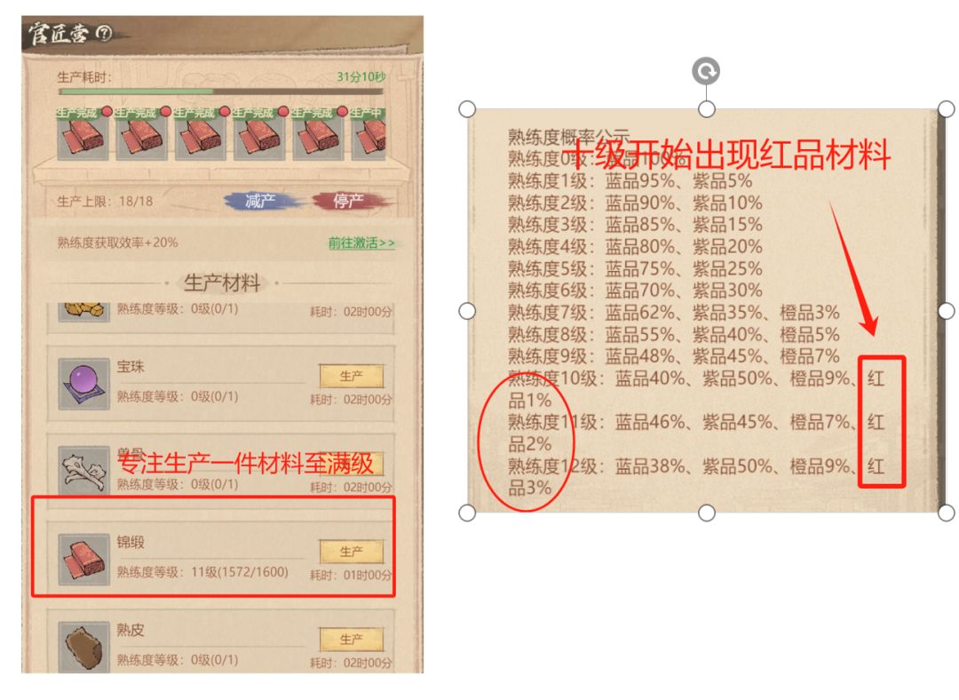 在游戏初期,建议玩家只专注于生产一种材料。快速提升该材料的熟练度,更快获取高品质红色材料。当积累到多余红色材料后,可以与州友交换自己所需材料
