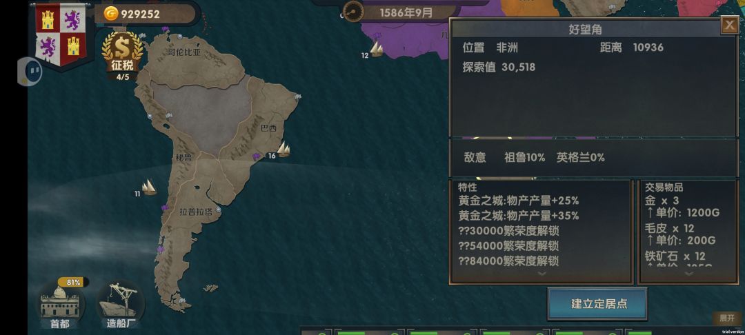 有着全图最多的金矿储备,而且不被列强注意,只要随便建一个安置点就可以快乐的探索挖金,缺点是路途远,土著实力强
