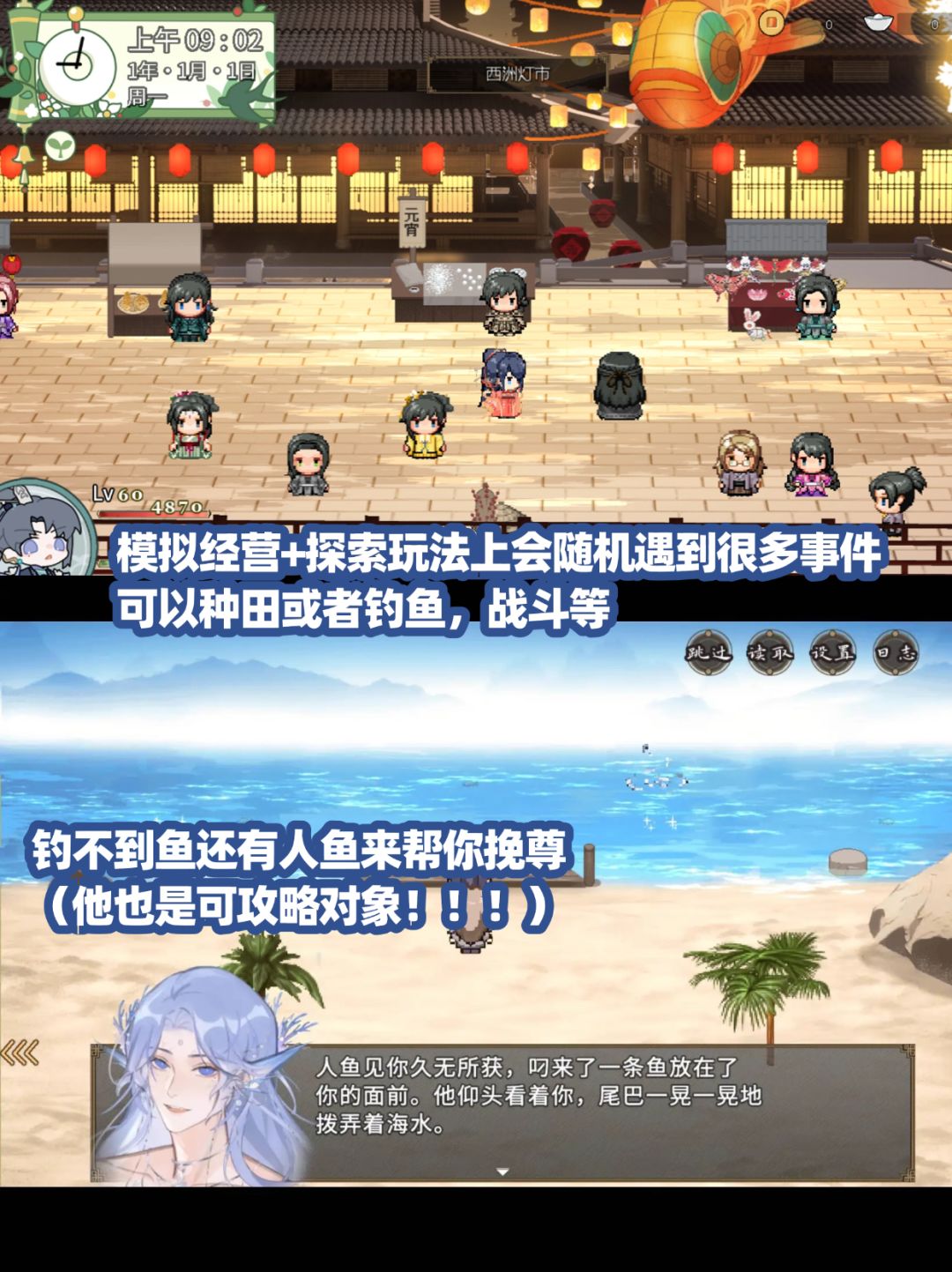 除了恋爱,也可以走事业线,角色养成上,你可以成为大侠,将军,甚至是九五至尊!!种田+钓鱼的玩法有,甚至在大地图探索时,还会遇到各种有趣的随机事件!!每个角色在好感度到达一定等级后会解锁新的个人线~