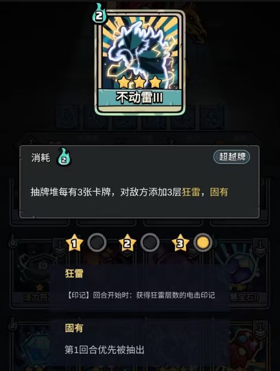 种族专属卡片:不动雷,黑唐手动冒险的核心输出(快速冒险的老板可以无视),手动冒险的朋友可以开局放个不动雷,然后结束战斗挂机就成。推荐手动冒险,毕竟只有前5层可以刷任务,如果前5层刷不到心仪的任务,可以放弃再来。如果是快速冒险的话就浪费了。再说单机游戏么,还是自己手动培养的崽拉出去才有成就感不是么~