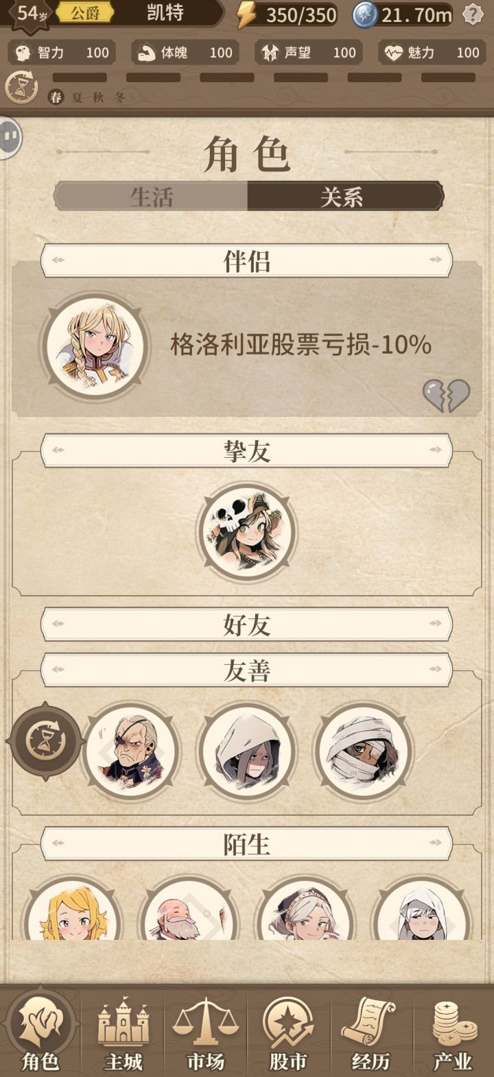 )凑10k钱出来(大概2-3k左右可以在自己的城里囤积居奇等回合差赚钱)中期应该算是游戏最有趣的时候了,主要任务是到处跑商(本人初游玩许多机制其实接触不深,只拉了符合我xp的两个人物的好感所以没有解锁股票,所以不太清楚这个股票机制怎么运行)个人觉得跑商的机制还是很有意思的,不过整体偏简单了,一方面,稳定能赚钱的货物太多,变化不大(就我体验下来格洛丽亚和布尔哈拉来看,前期可以农物、矿产,中期丝绸、烟草,后期主要是星辉矿)虽然说这样的设计其实符合各个地方应该有资源禀赋和比较优势,但是无上线的货物供应和需求使得体力成了我跑商的唯一限制。另一方面,跑商要求也太低了,一有钱其实就可以转进跑商,几乎成了必要的过渡手段(虽然好像这样才符合游戏名),随机性也不算高,虽然有劫匪不过感觉好像无关痛痒。