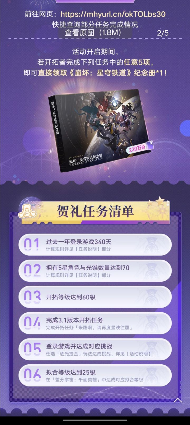 第一个就是占比最高的220万纪念册活动方式,开拓者只要任意完成5个贺礼任务,即可获得纪念册一份。贺礼任务清单包括六个,