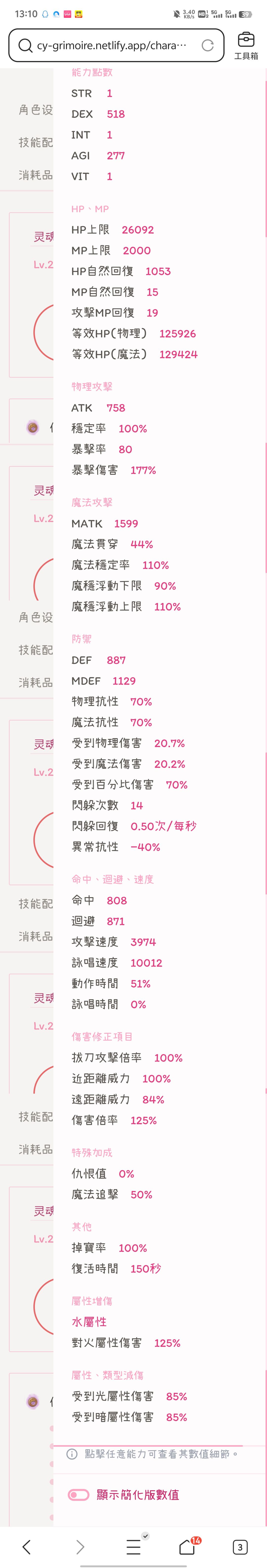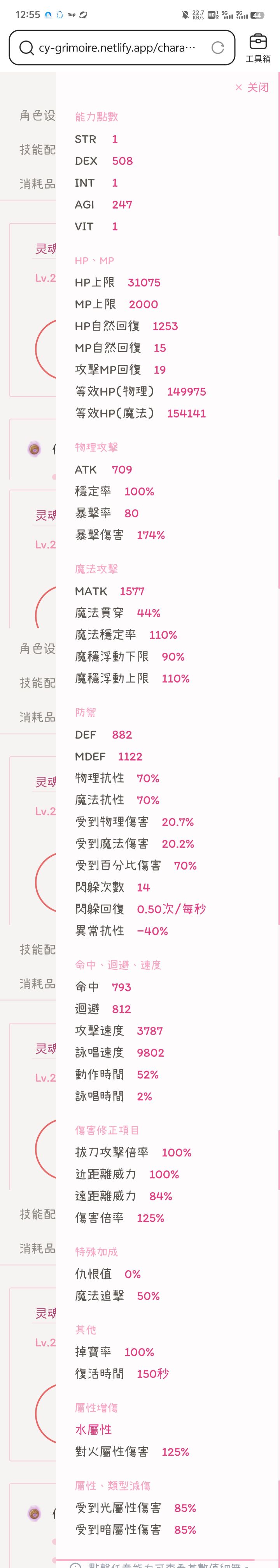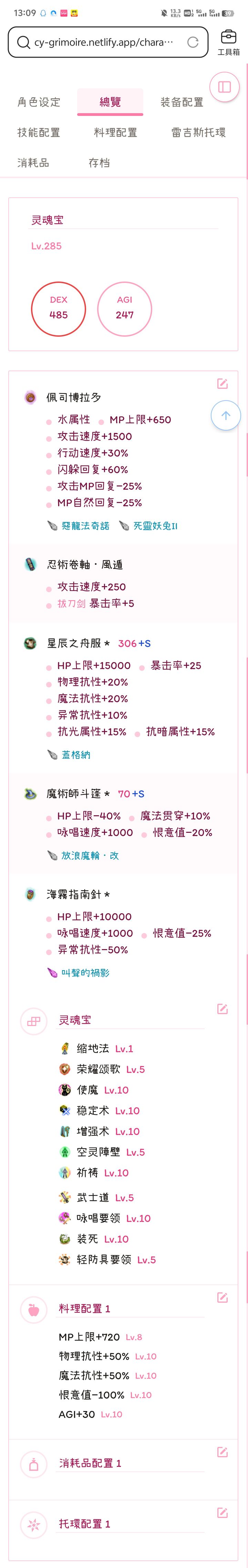 285等级下,仅使用敏捷料理可达到万咏,差106攻速满行速