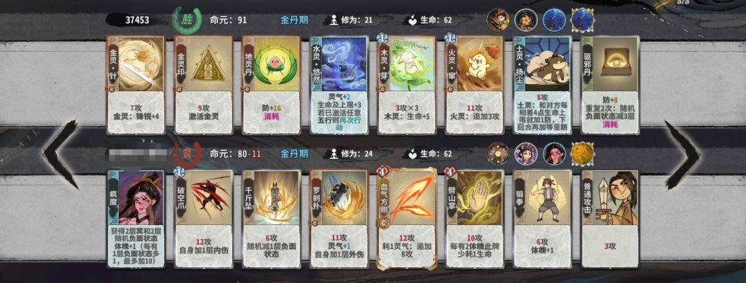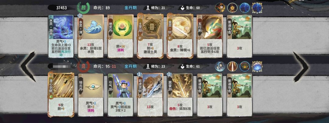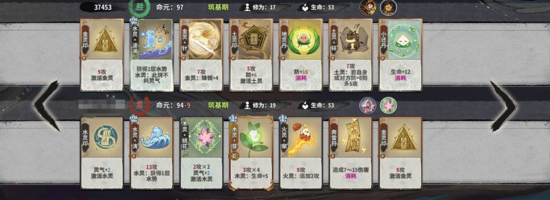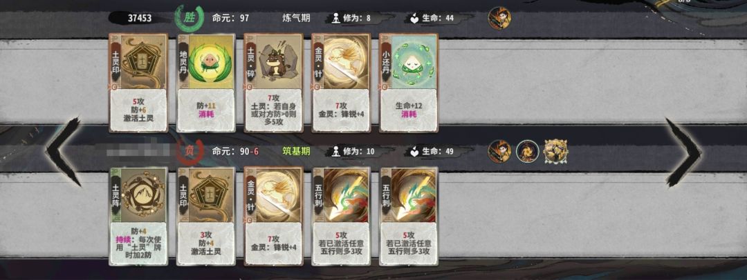 当然,作为点了双葫芦共鸣的人,我们可以考虑在卡土金的过程中在手牌里留下水灵涛,在5-6轮上金丹后选择葫芦,可以直接一动涛接五行刺,大大提升金丹战力。