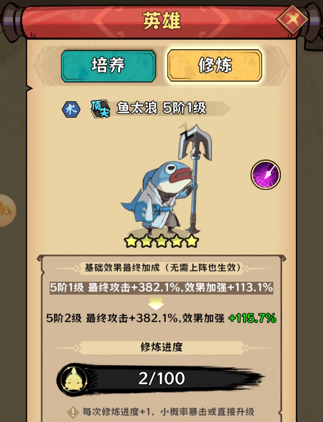 一旦英雄升级到50级就可修炼,修炼需要花费氪金资源或玩得很久但提升巨大,它会进一步加成英雄的基础效果,不想氪或随便玩玩的玩家可跳过。