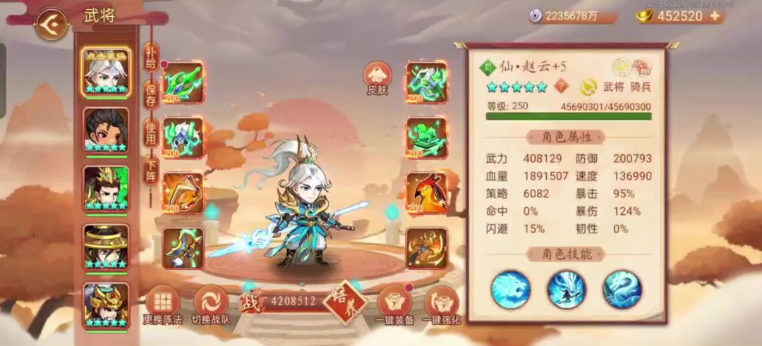 这里用的徐庶站后排,带上四个骑兵打。只有徐庶赵云是开了兵魂的,一样的叠攻击蓄大招收割即可。因为骑兵本身就是带控制的,全员超速加上徐庶提供的增伤燃烧封技等效果,就不再重点说打法了,自行参考视频即可。