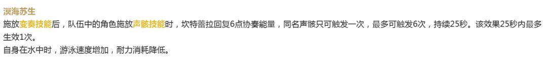 另外还有回路中还有前文提到的另一个重点,即声骸技能计数机制,在变奏后坎特蕾拉获得一个BUFF,当队伍中角色释放声骸技能时回复6点协奏值,同名只触发一次,最多六次,这36点协奏有自身技能都算声骸的四次再加上队友的两次,当前版本就能吃满,超快的协奏速率让坎特蕾拉更偏向短轴速切。