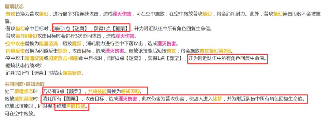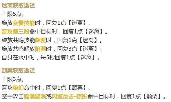 迷离条和颤栗豆子的获取如下,很简单就能打满,变奏入场一点,开大招三点,共鸣技能一点就满了,比较特殊的是水中五秒回复一点,搭配只要有迷离就能进入【蜃境】这个在天上飘的状态,皆若空游无所依搭配翱翔,真的是随时随地启动啦,晚上飞阿漂家里去都行,大世界赢!