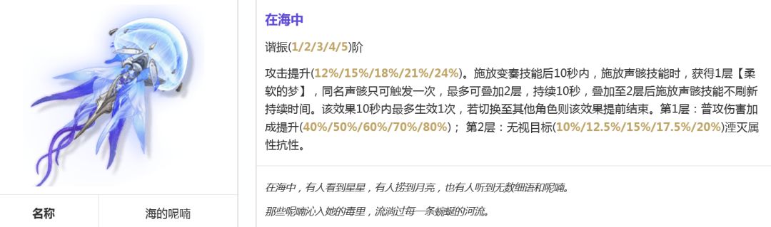 坎特蕾拉的武器首选专武【海的呢喃】,很好看的水母捏,属性为攻击力和爆伤,变奏后10秒内,施放声骸技能时,获得1层【柔软的梦】最多两层,一层提升普攻伤害,一层无视目标湮灭抗性,二层效果可以说是很变态的,无视目标抗性相当于独立增伤乘区,但是很可惜该效果切换其他角色会结束,对于一般来说用作副C的坎特蕾拉性价比就降低了很多,当然对高命座主C是很强的提升。