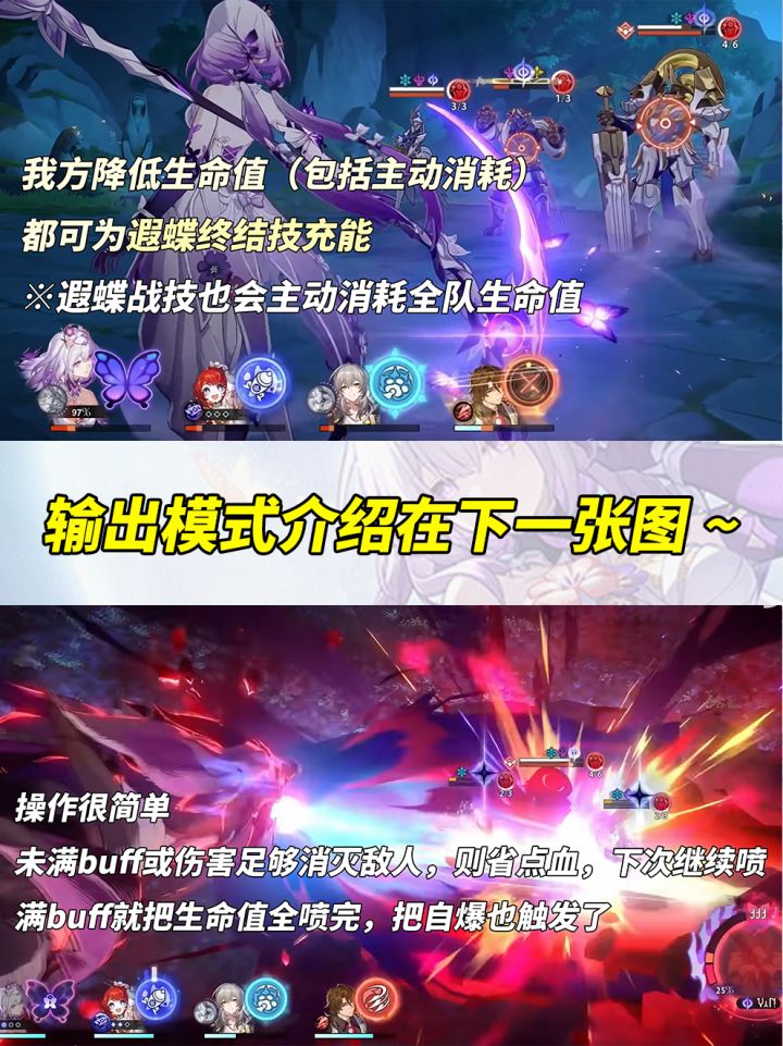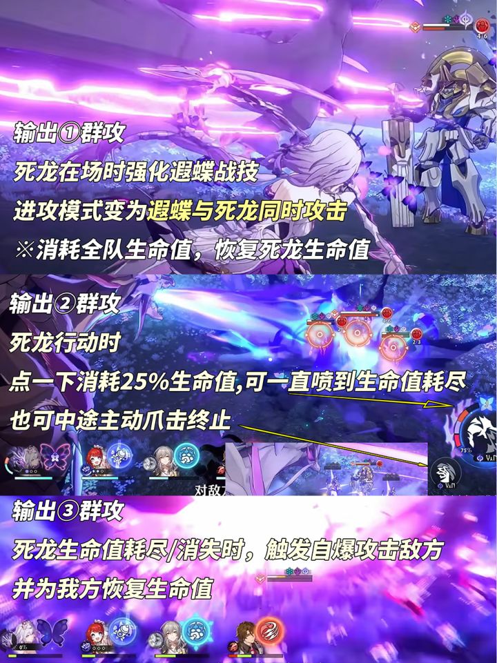 ①遐蝶行动时,战技获得强化,遐蝶与死龙同时进攻敌人,并扣减全队生命值,治疗死龙生命值;