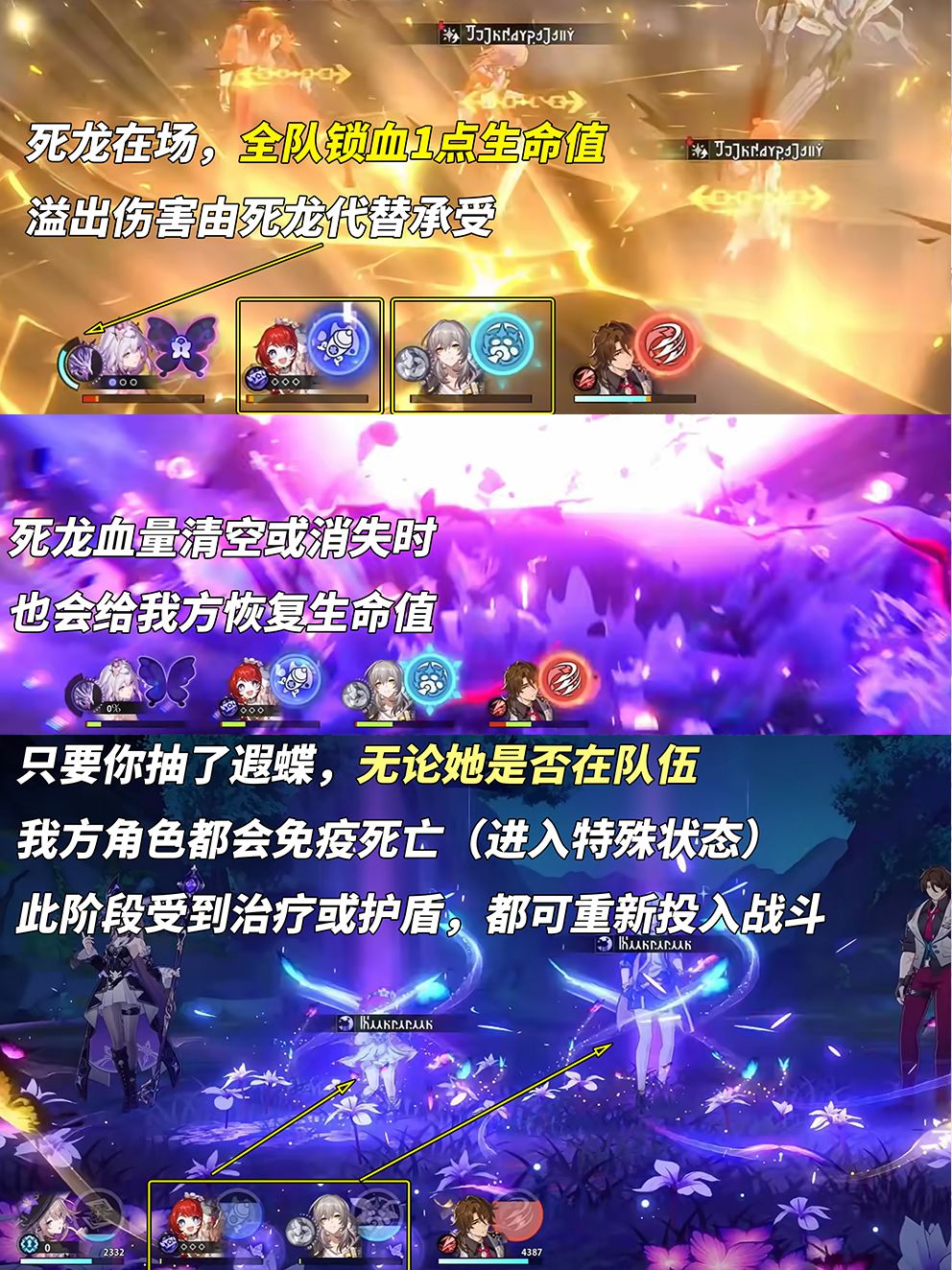 ①死龙在场时,队友血量会锁血1点,后续伤害由死龙代替承受;