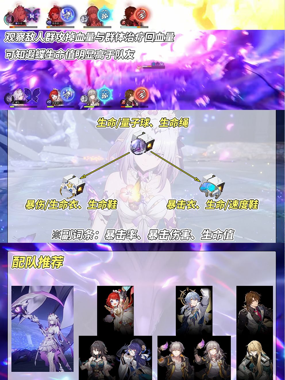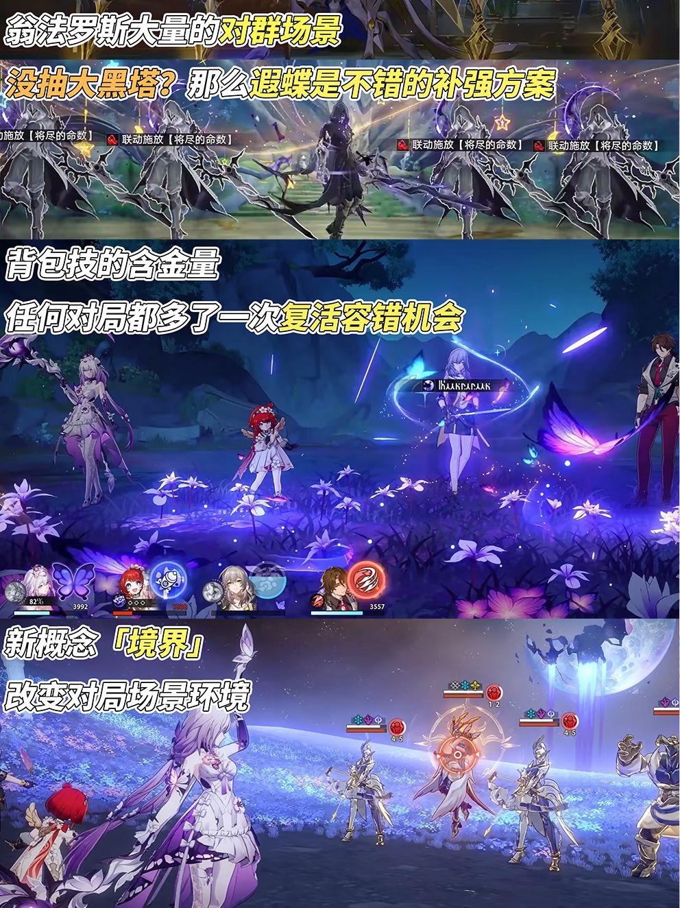 一堆描述看得眼花缭乱?遐蝶的定位实际上可简化为一句话‘量子对群爆发角色’,完美契合当前翁法罗斯主推的对群环境。是否抽取遐蝶,可考虑以下三点: