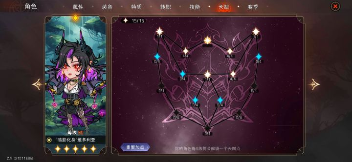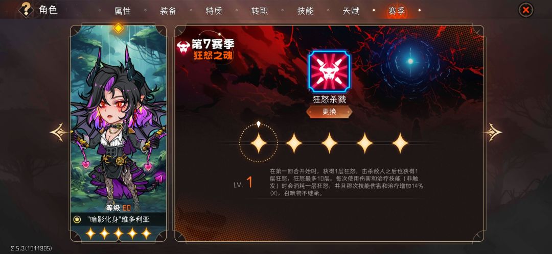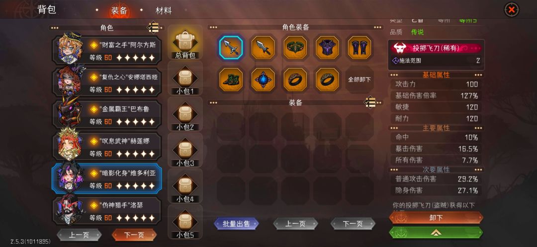 然后实际上飞刀刺的装备可能一直都没怎么变过,各个赛季都通用的,选择帝国化身圣物然后带毁灭和暗影两套装备,这两套装备的效果和飞刀刺太搭配了,然后带一个强度戒指和减cd戒指(为了前期没刷到飞刀紫色词条击杀刷新cd导致不能频繁输出预备的),项链带的是多重决意,在点出飞刀紫色词条的多目标选择以后能方便再多打几个目标从而增加击杀刷新各个技能,主武器带的是飞刀专武和普攻专武,因为输出全在飞刀刺上面,所以仅需飞刀刺一人的装备成型,其他的工具人中帝刺和帝弓把命中拉上来即可,飞刀刺的装备主词条基本上就是主需命中副爆伤和全伤,然后副词条可以刷一些隐身伤害之类的,这赛季专武还自带了一个技能词条(默认出的是对半血以下的敌人命中率+20%,但是在过了60层大漩涡精英难度以后可以去无尽连战刷一波六十难度的boss把词条刷成范围+2)刷飞刀刺更快了,帝刺带兰斯特装备刷速度,帝弓帝牧就随便穿了。