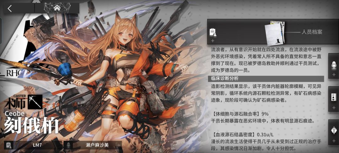 而根据对刻俄柏的干员档案可知,小刻是从有意识就开始流浪了,在遇到罗德岛之前她的整个人生都在流浪中度过,然而小刻在这种情况下的矿石感染程度甚至远低于如今成为小聋瞎的艾雅法拉,不知道该说她运气好还是运气差。