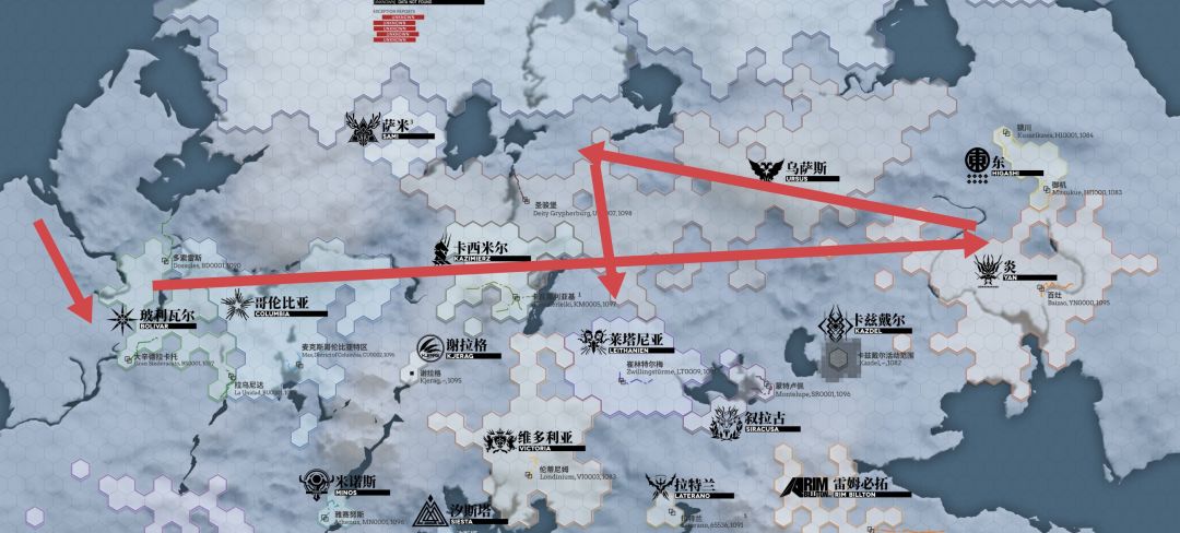 已知她从泰拉大陆地图的最西边的玻利瓦尔出发寻找米诺斯,一路走到东方三国交界处折返回来,从北方迂回抵达莱塔尼亚。