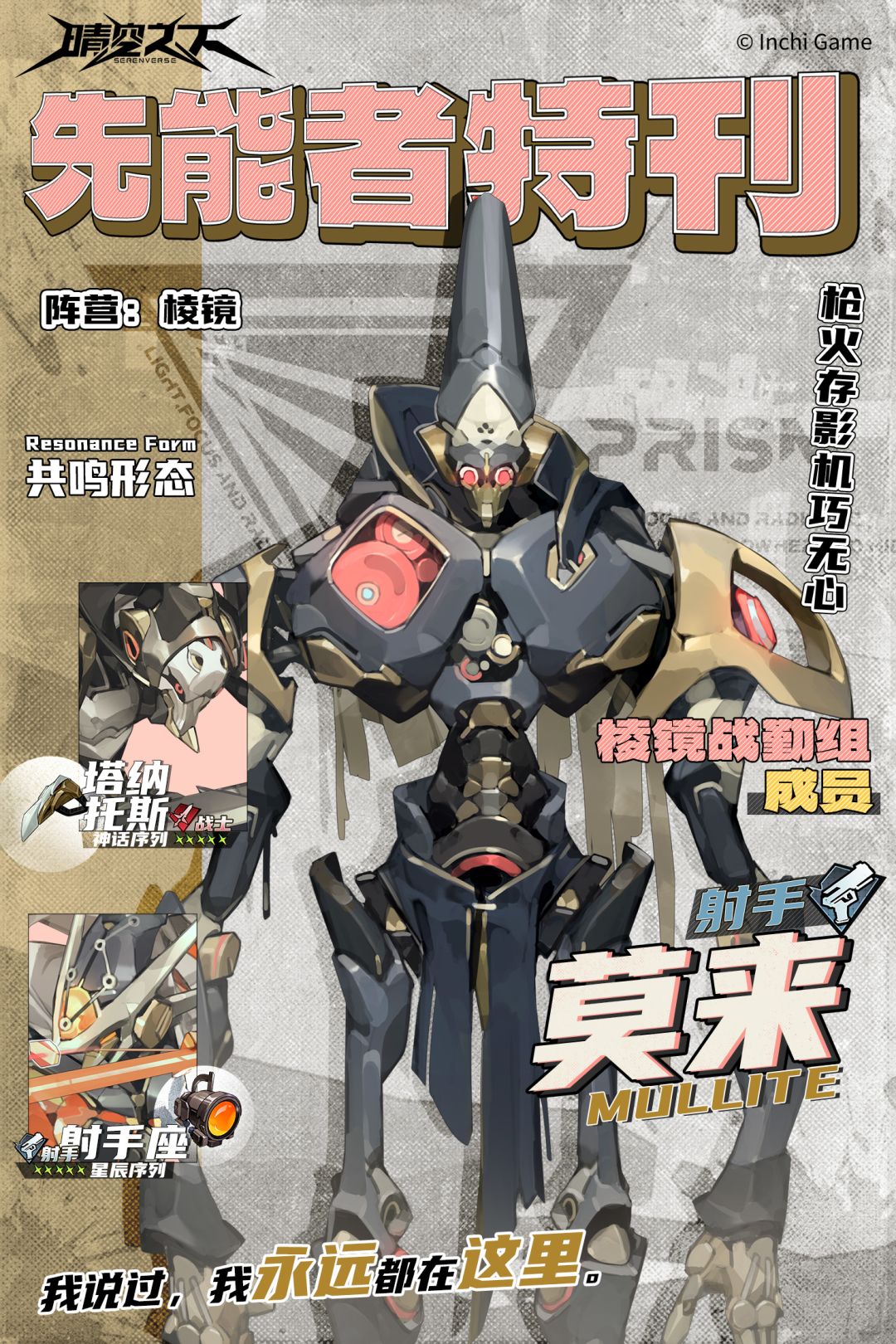旧日战争中幸存的战斗型CIFA,后被挖掘出土,并修改程序协议以适应当下环境。目前被编入棱镜战勤组,作为代理店长常驻雷卜瑟馆内。