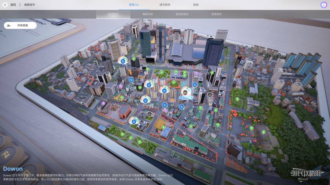 【M】快捷键可以打开【编辑城市】的详情页,此处可以看到城市里生活所有小人家庭,也可以调整城市的外观和各种数值。具体功能会在后续的【城市管理】进行说明。