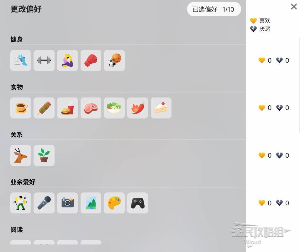 偏好:可以选择10个小人喜欢以及厌恶的偏好,小人自主行动是会主动做自己喜欢的偏好,当被迫做自己厌恶的偏好会受到情绪压力。