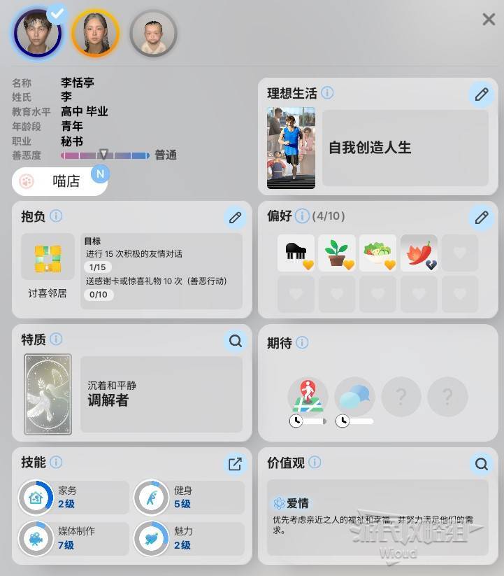 理想生活:随时在人物卡进行更改,理想生活是小人总的发展目标,就目前版本而言理想生活不会特别影响什么东西。