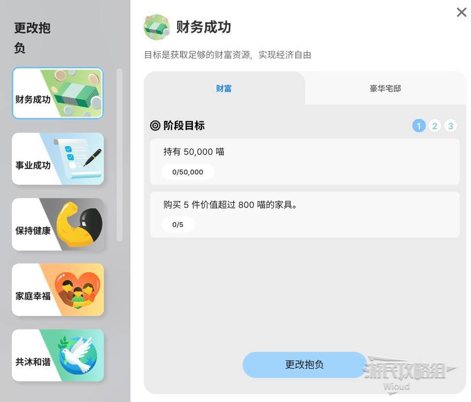 如选择【财务成功】抱负就会有三个不通过阶段的目标需要达成。