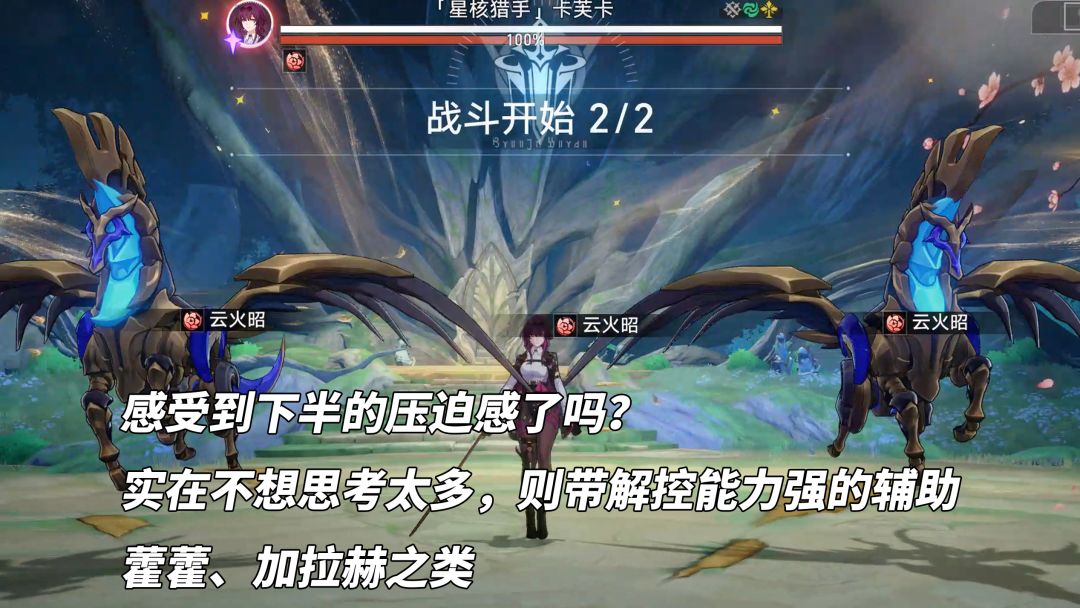 ③建议在消灭第1波最后一名敌人前,尽量恢复自身状态(终结技能量、战技点、血量状态)。因为第2波由‘卡芙卡+2只流星铁鹰’组成,非常容易陷入连环控制的节奏。