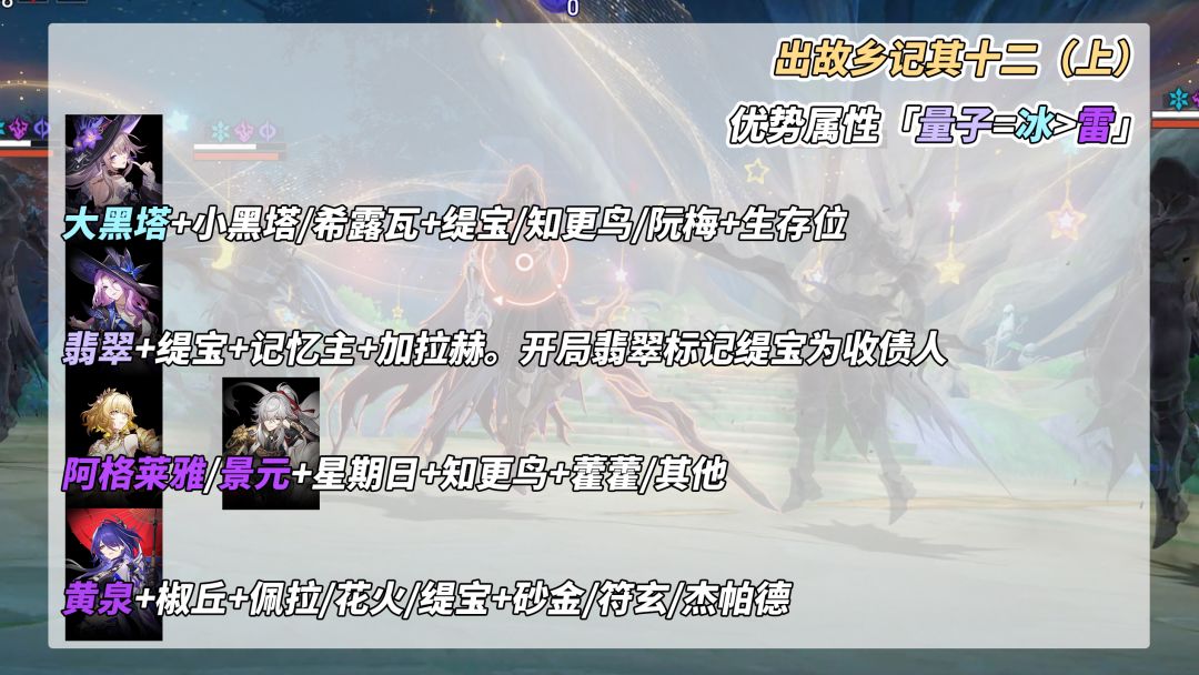 优势属性「虚数>量子>火=物理」,除了卡芙卡身上有40%雷抗,其余敌人都无特殊抗性。这期敌方控制手段极多,尤其是新增的两种敌人,需特别注意机制。