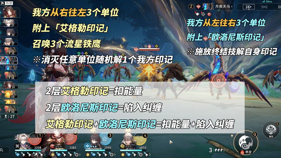 ①印记叠加规则介绍。正阳狮鹫,横扫从右往左3个单位并附加1层「艾格勒印记」(消灭敌方随机解1个),并召唤3个流星铁鹰。月夜天马,横扫从左往右3个单位并附加1层「欧洛尼斯印记」(施放终结技解除自身印记)。