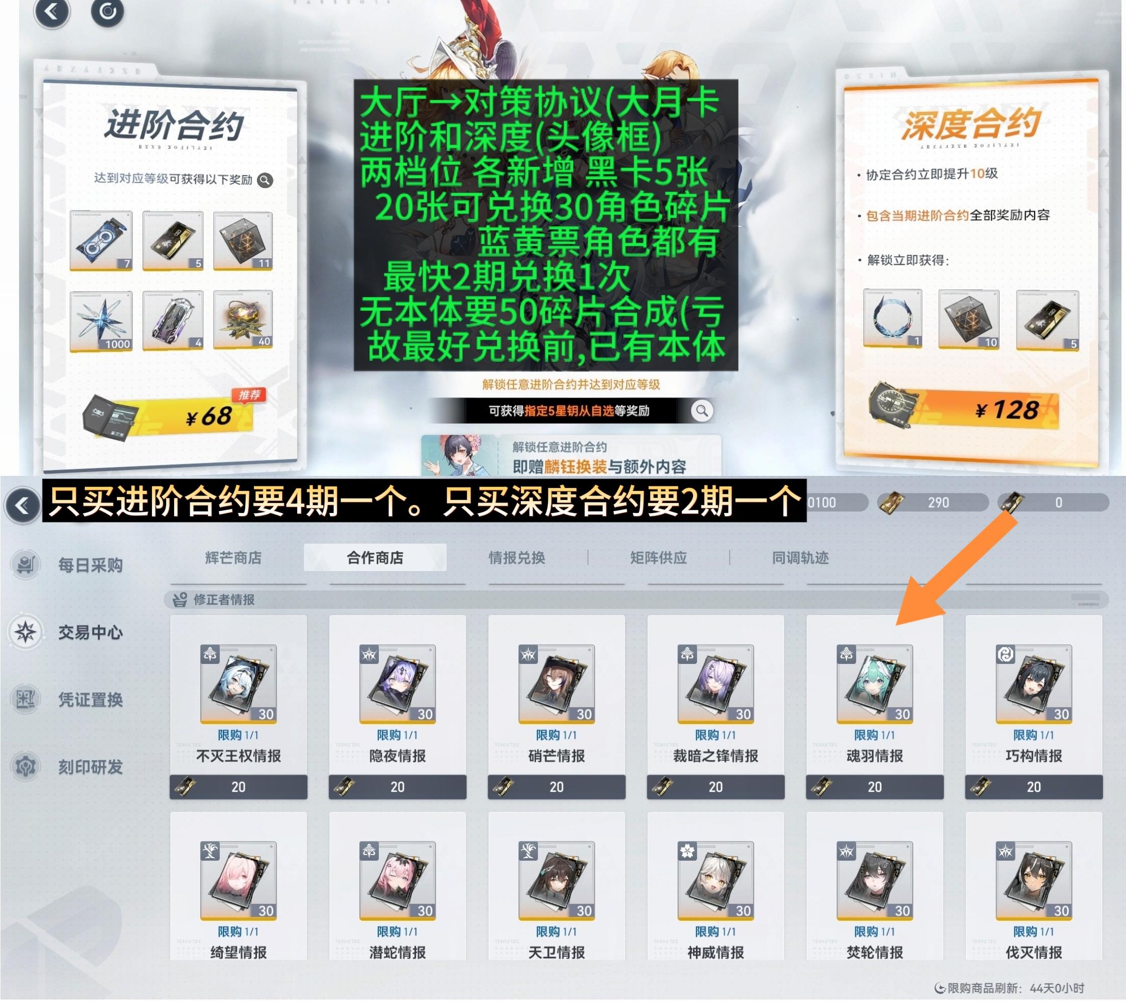 ①对策协议即大月卡商店(以往随版本刷新,此次不是)。4.5版本新增氪金黑卡,进阶合约4期30角色碎片,深度合约2期30角色碎片。