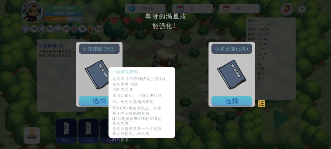 除了开局舒服以外,本游戏还有俩事件显著利好养狗:机关人以及降回1级。前者刚需大直伤,打死第一次给绿白技能自选四个,第二个自选二级全技能,后者不用多说蹭到8级回溯爽吃技能,但是回溯降属性常规build容易死,但狗伤害大头是技能星级所以很easy。