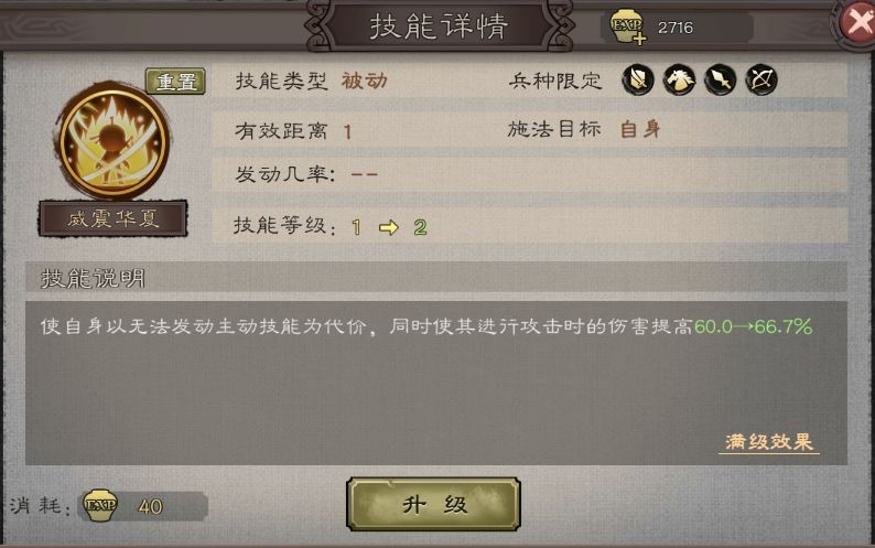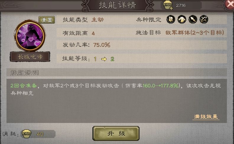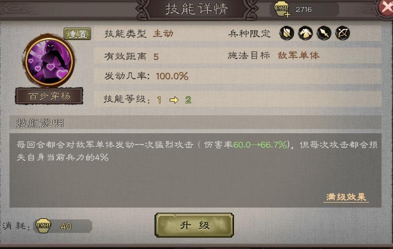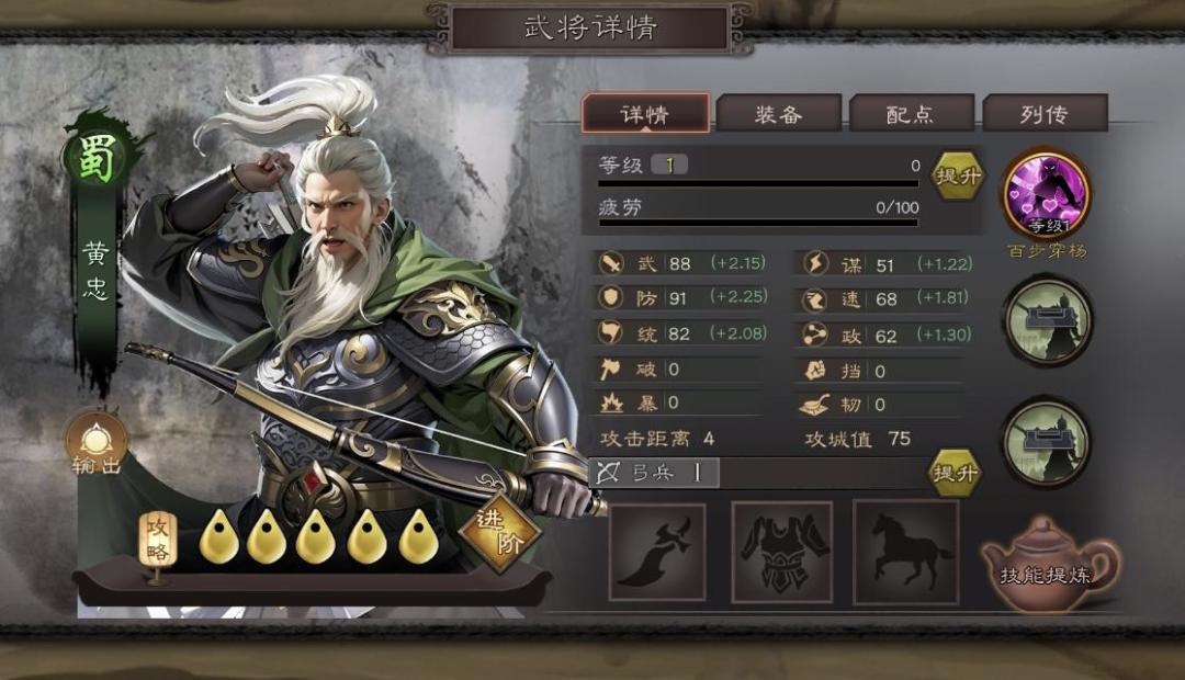 老当益壮的黄忠,精神固然可敬,不过年龄也是摆在那里的。故而他成为了这里面的吊车尾,即便定位是输出,可88点的武力值和2.15的成长速度,反而不如防御方面的潜力。百步穿杨技能,在游戏里的作用是每个回合对敌军单体发动猛攻,满级状态下伤害率可以达到120%。不过有一个副作用,就是每次攻击会损失自身当前4%的兵力,有点杀敌一万自损三千的味道。