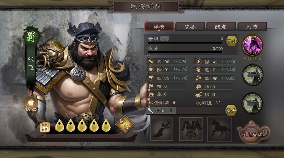 这次张三爷真的排名第三了,根据TAPTAP版《城防三国志》的设定,张飞在五虎上将之中武力值也没有过百。好在作为输出型的猛将,张飞的长坂咆哮技能可以最高给敌军群体目标造成320%的伤害率,而且是无视兵种克制关系的真实伤害,这也是他能够踩马超一头的原因。