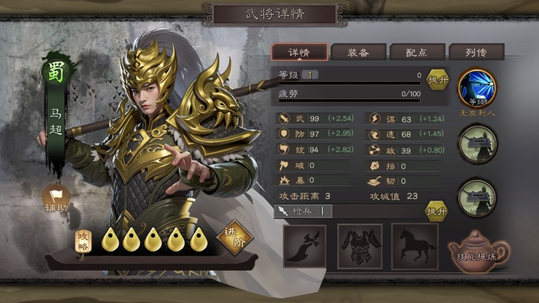 西凉锦马超在TAPTAP版《城防三国志》游戏里的定位,是让我有点意外的,因为天生菜刀人设的他竟然成了辅助。尽管99点的初始武力值和2.54的成长速度依旧强劲,然而他的专属技能先发制人,只是能在战斗开始的前三个回合里最多提升己方2到3个单位20%的速度属性,并提升70%的连击概率。如果不在第二和第三技能栏里做强化输出的搭配,马超就只是个群体加速器了。