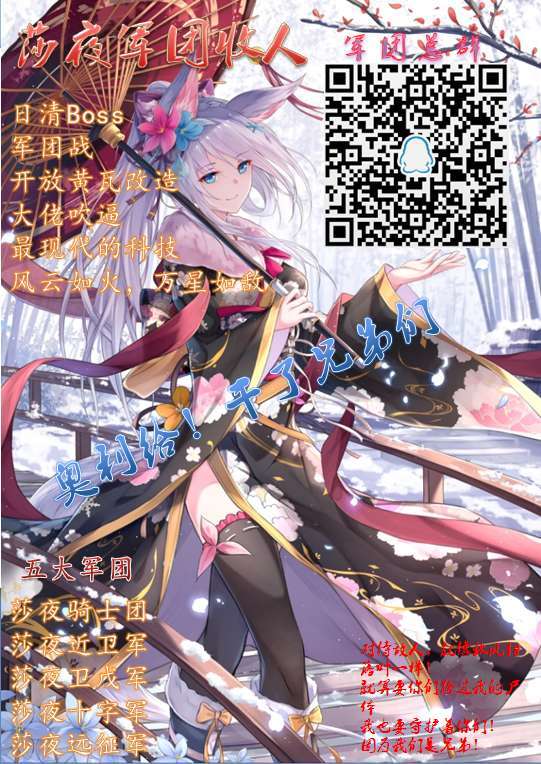 莎夜军团常年招收各类机动玩家,无论萌新大佬。主团尤其欢迎竞技场达人加盟,群号827832133,也可来水群