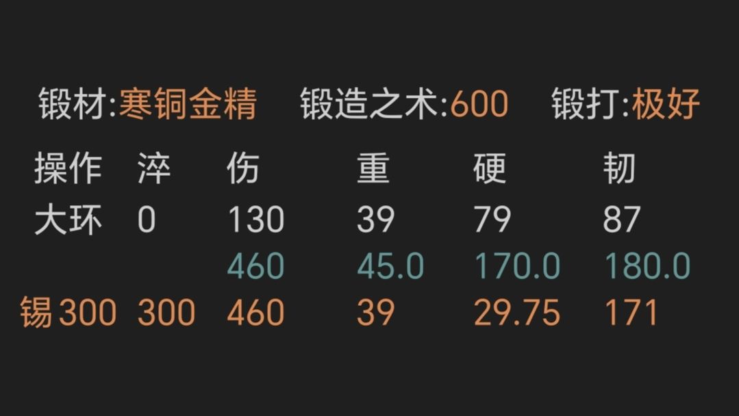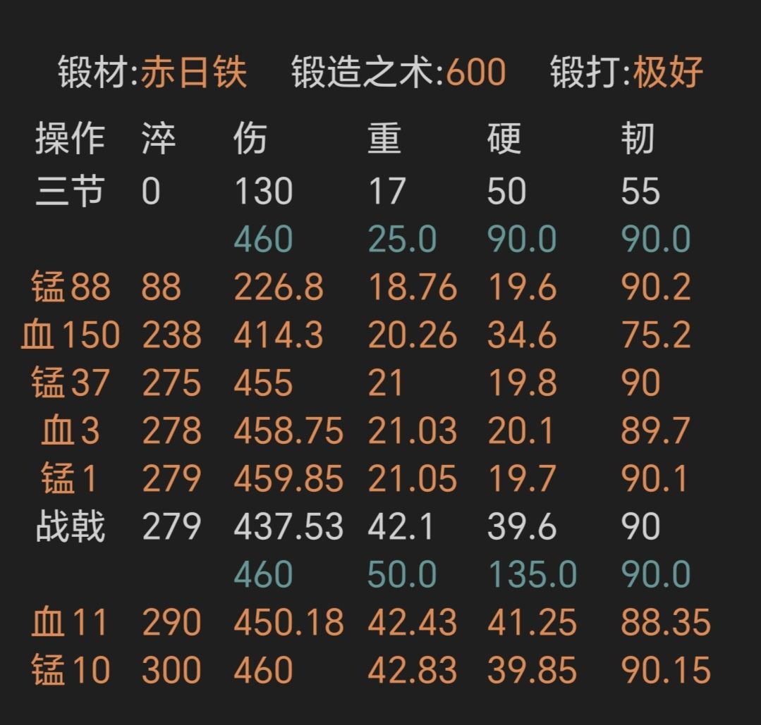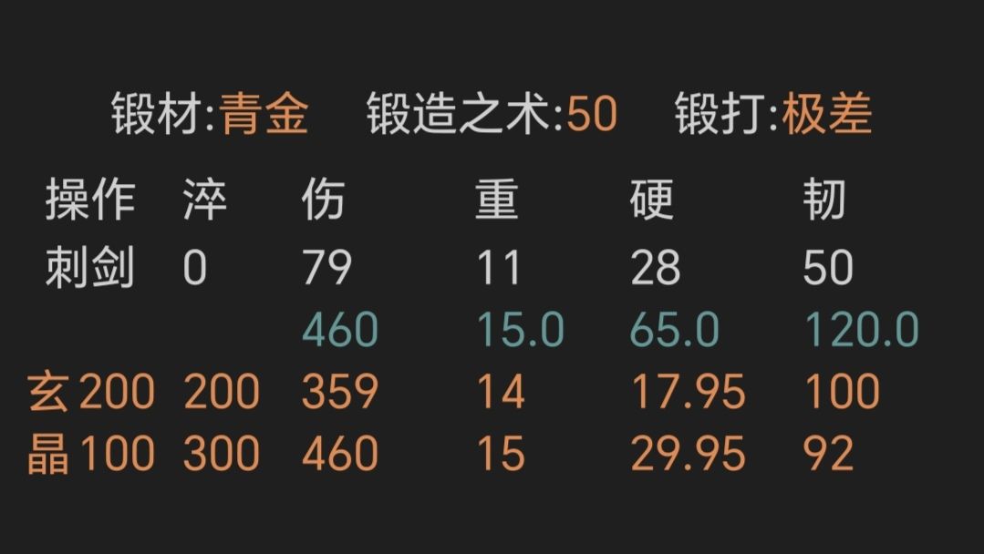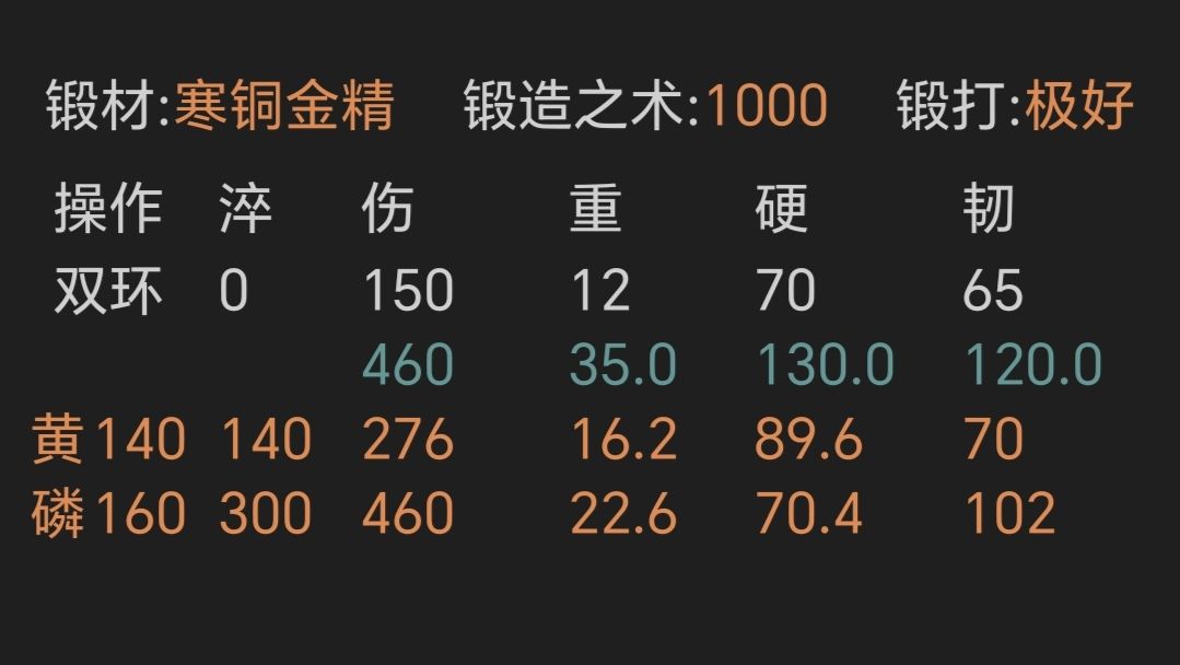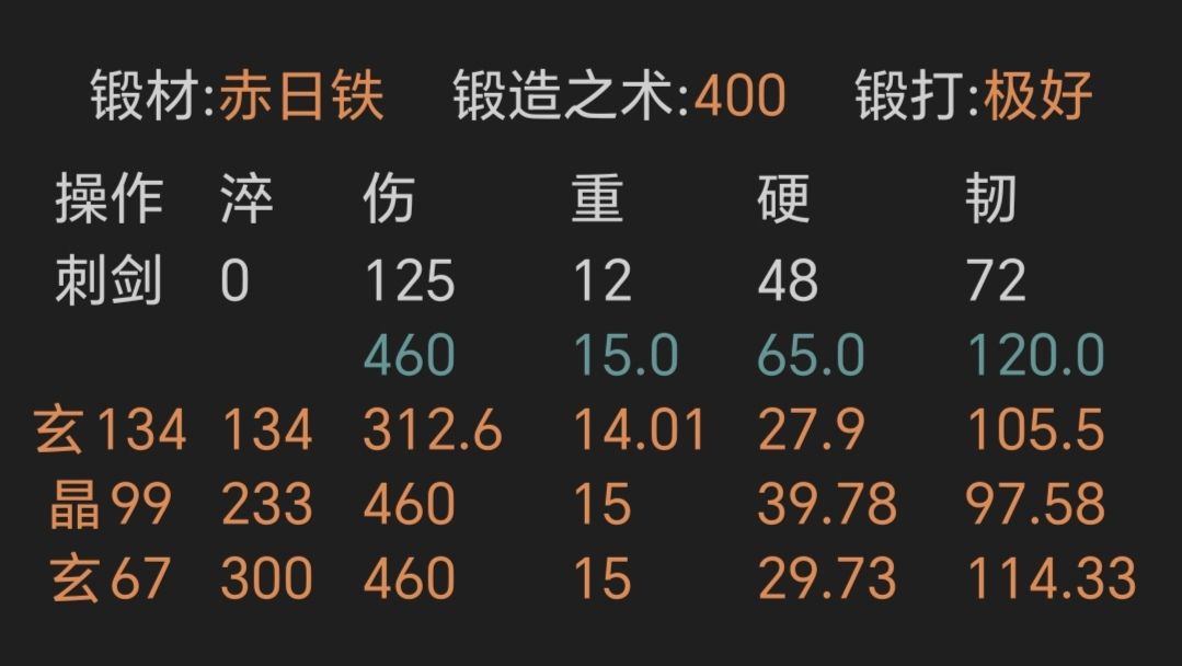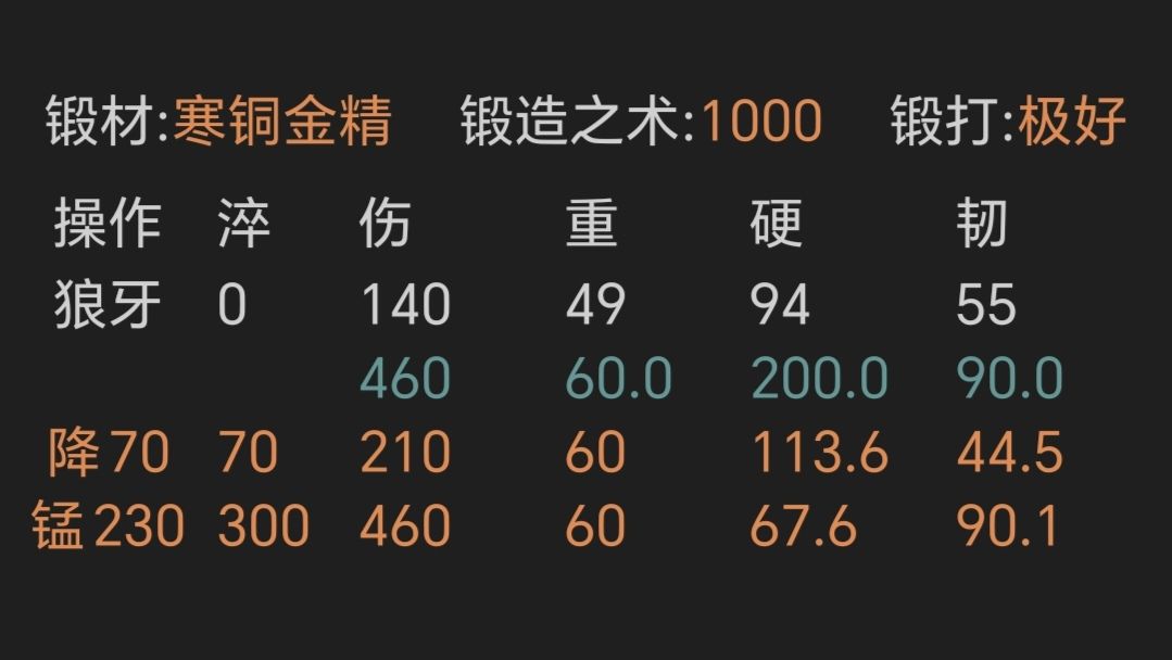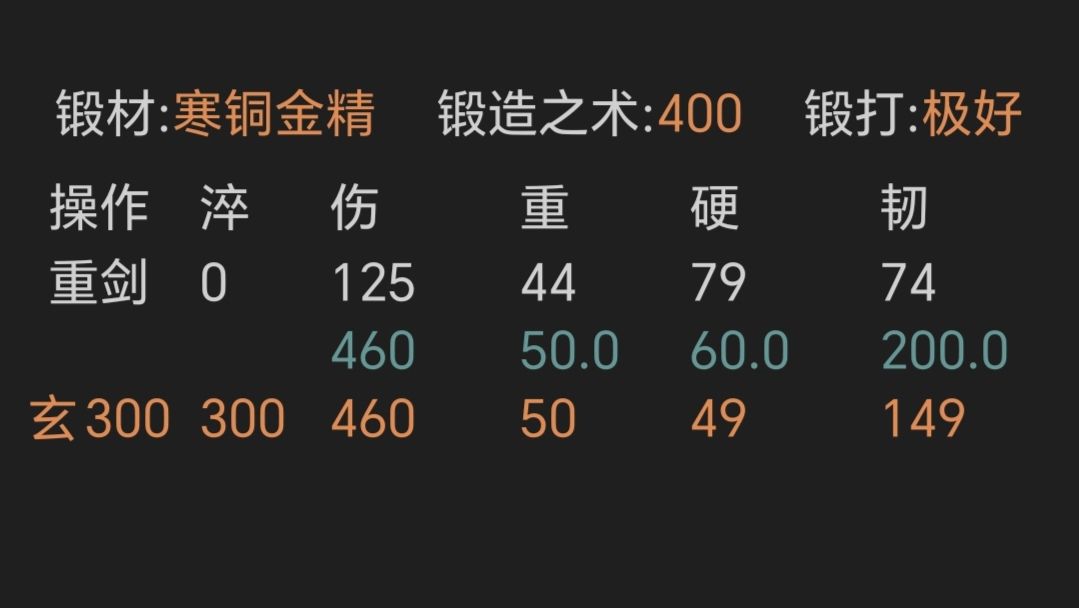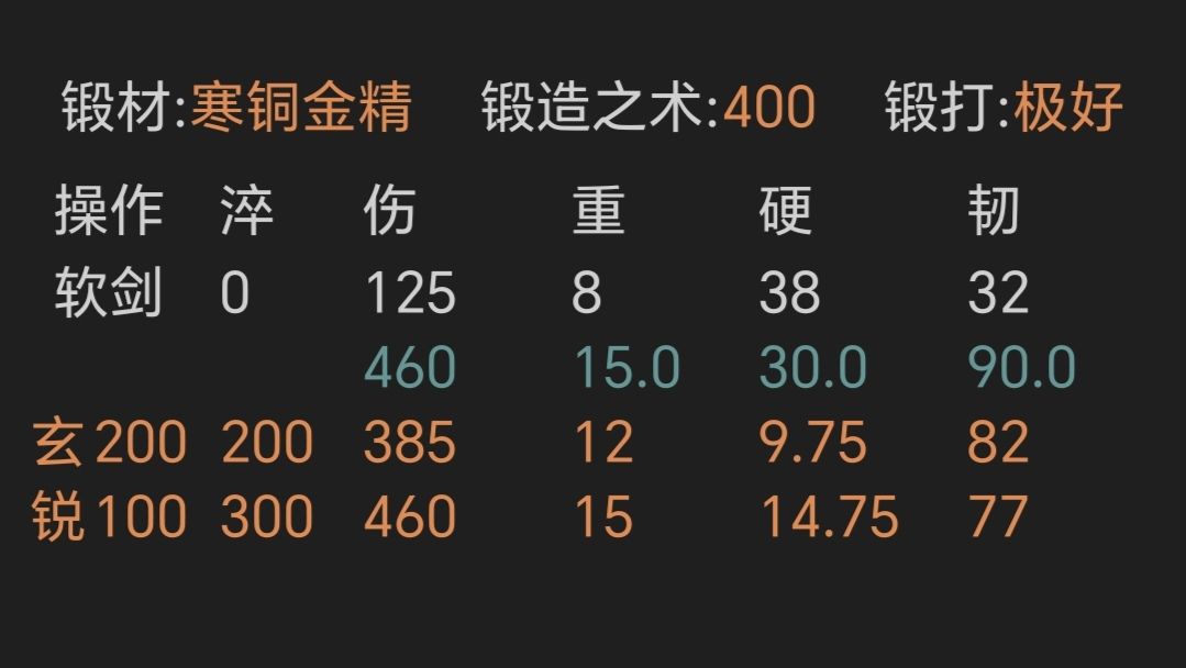 ④寒铜金精重剑,锻打极好且初始韧性越高越好,上限79