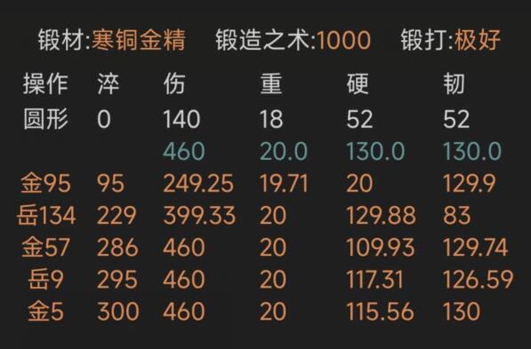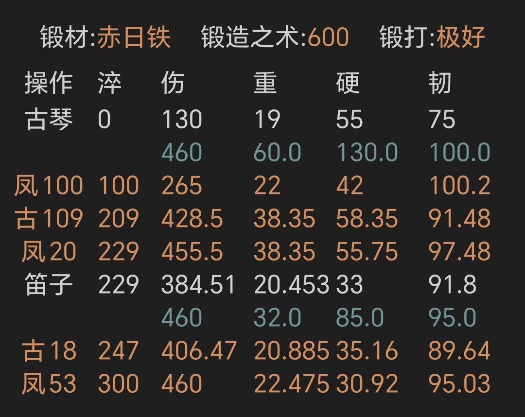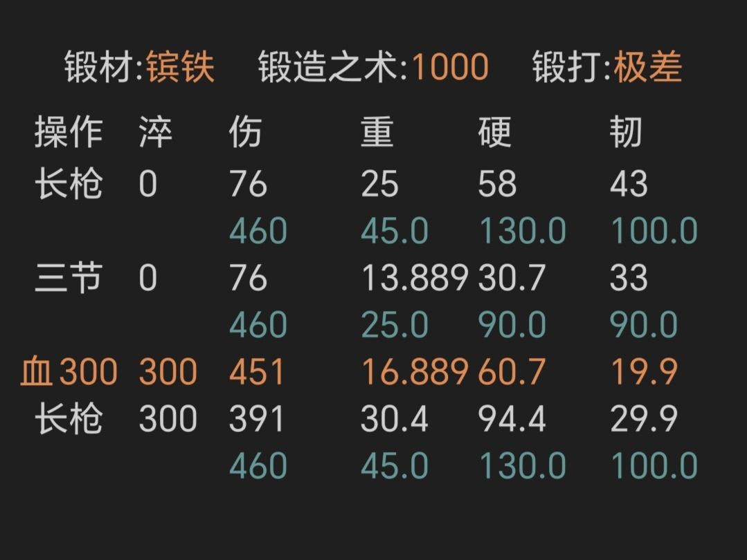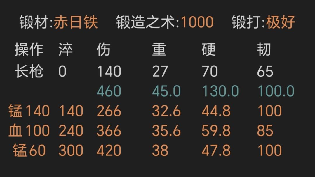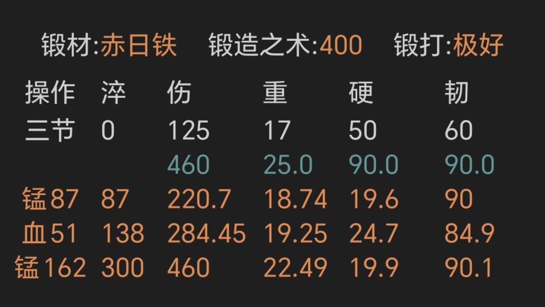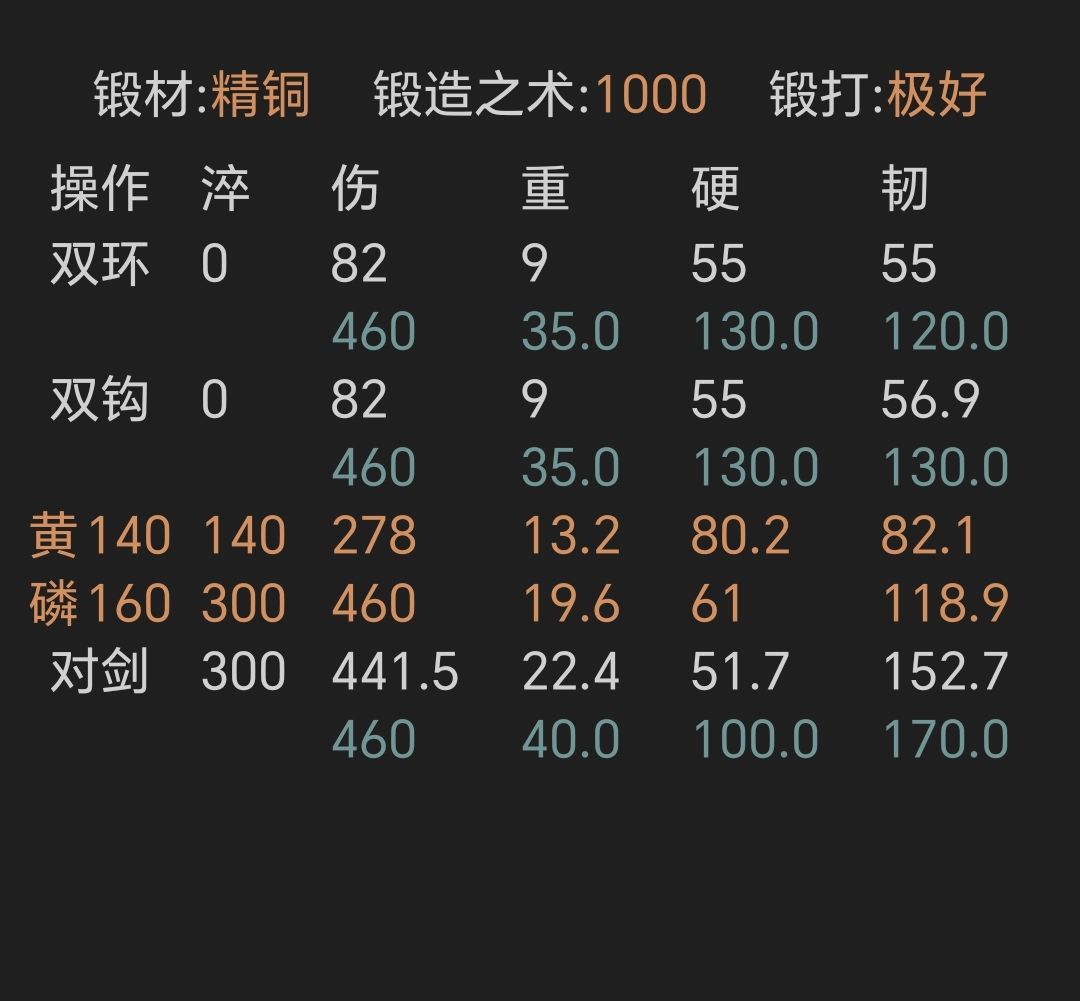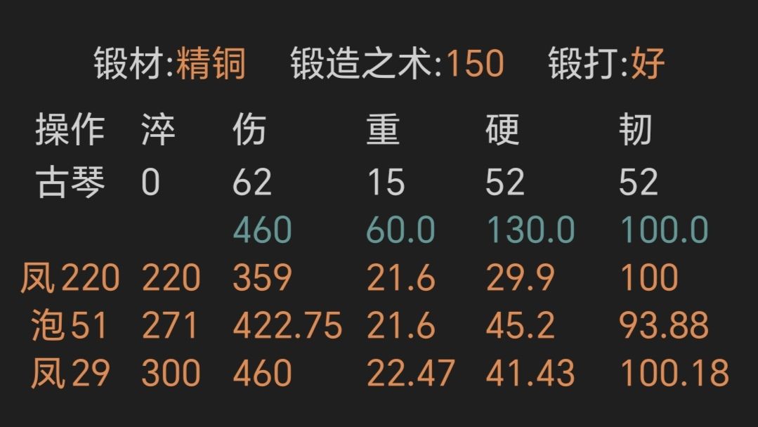 ④寒铜金精重剑,锻打极好且初始韧性越高越好,上限79