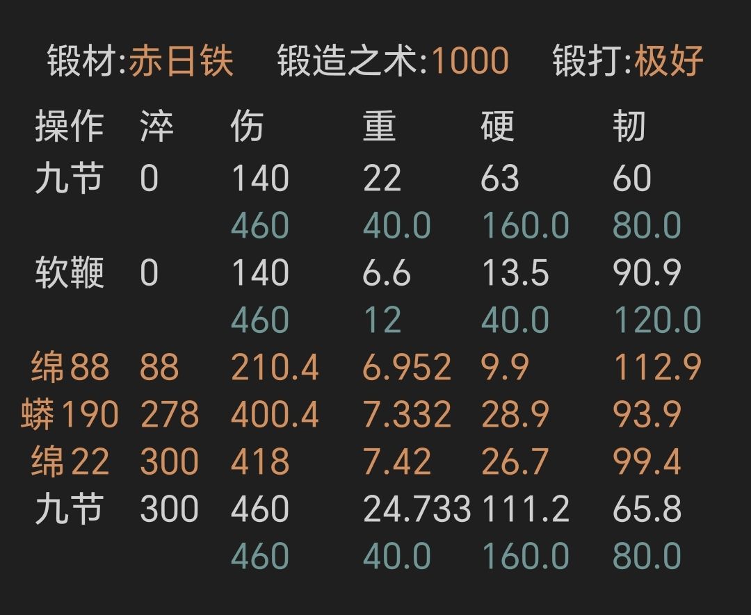 ②赤日铁刺剑,锻打极好且初始韧性越高越好,上限77