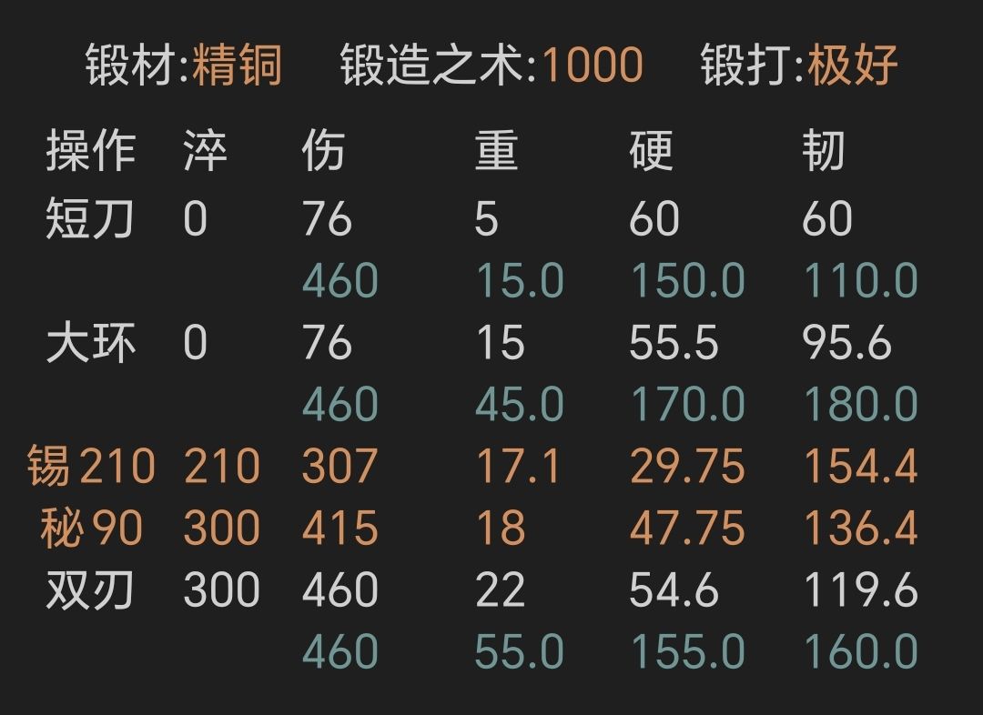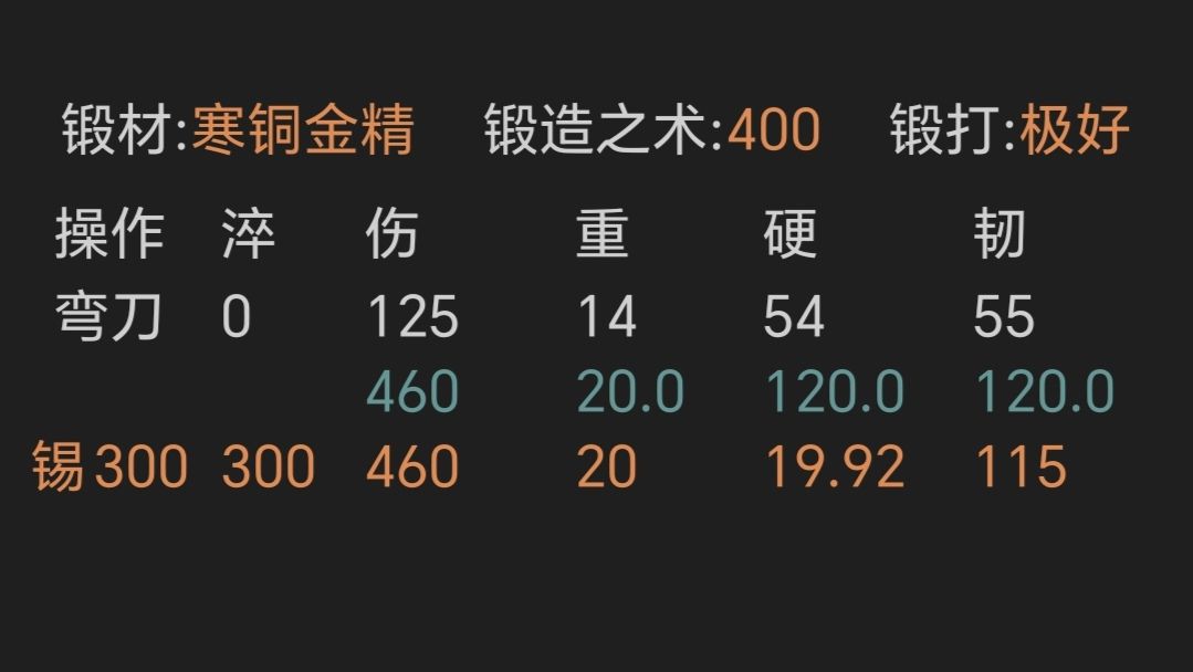 ②寒铜金精弯刀,锻打极好且初始韧性越高越好,煤炭材料多想要追求满韧可以打至初始60韧性上限