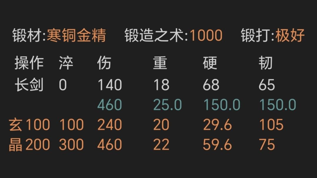 ⑥寒铜金精长剑,初始锻打极好且初始韧性越高越好,上限70