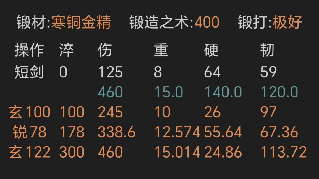 ⑤寒铜金精短剑,锻打极好且初始韧性越高越好,上限64