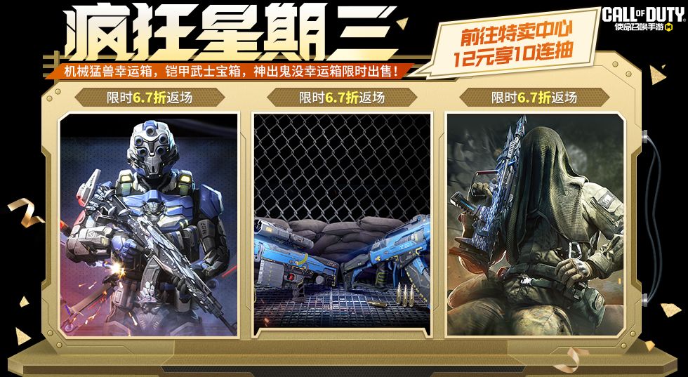 4月2日(本周三),疯狂星期三再次登场。本次返场的高人气宝箱分别是:机械猛兽幸运箱、铠甲武士宝箱和神出鬼没幸运箱。活动期间战士们将享受6.7折的超值福利优惠,快来看看吧~