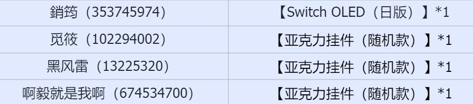 恭喜以下导演在本次活动中获得【Switch OLED(日版)】*1、【亚克力挂件(随机款)】*1。